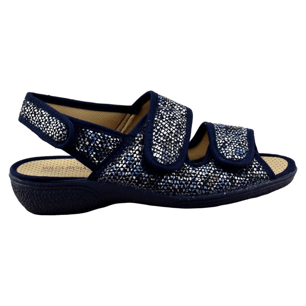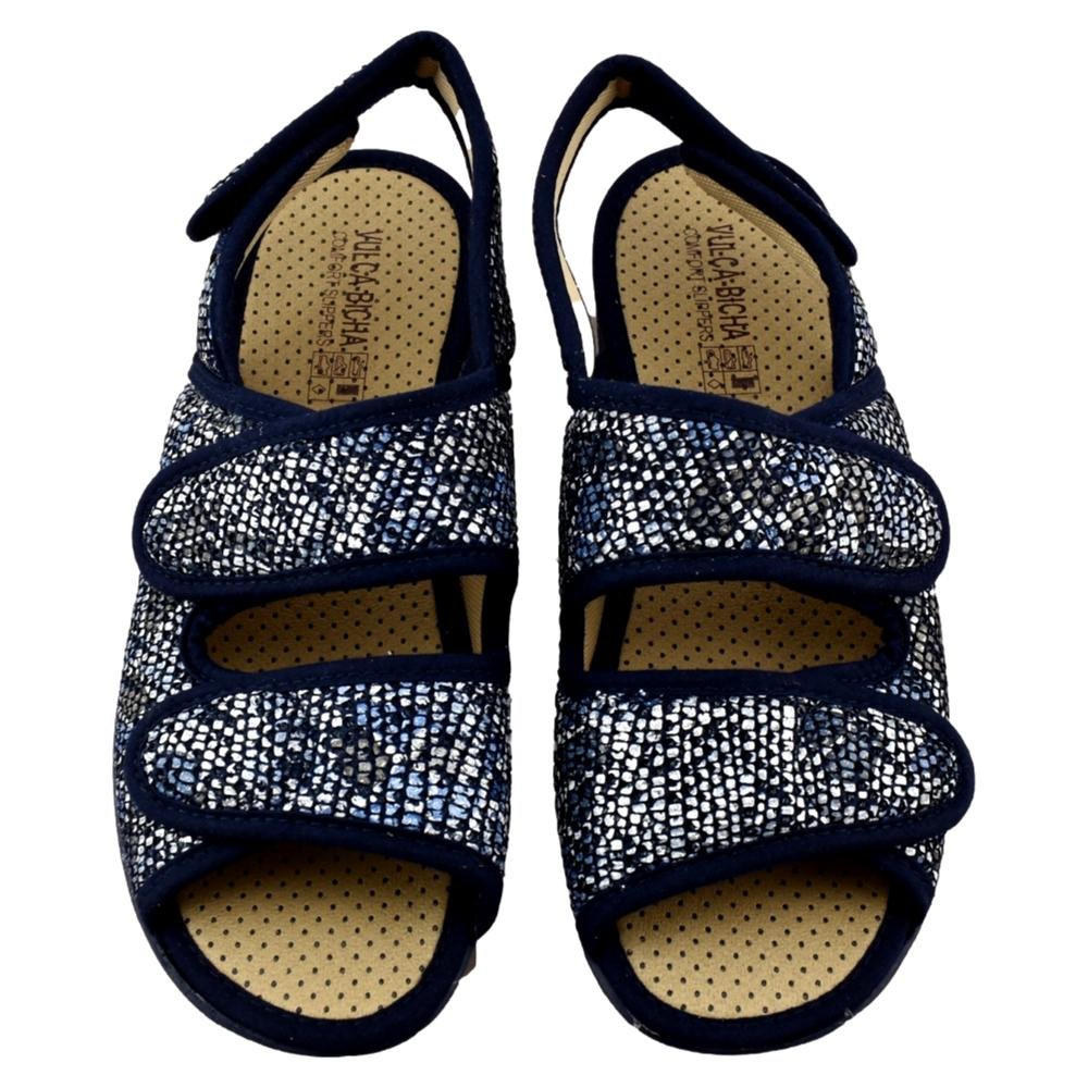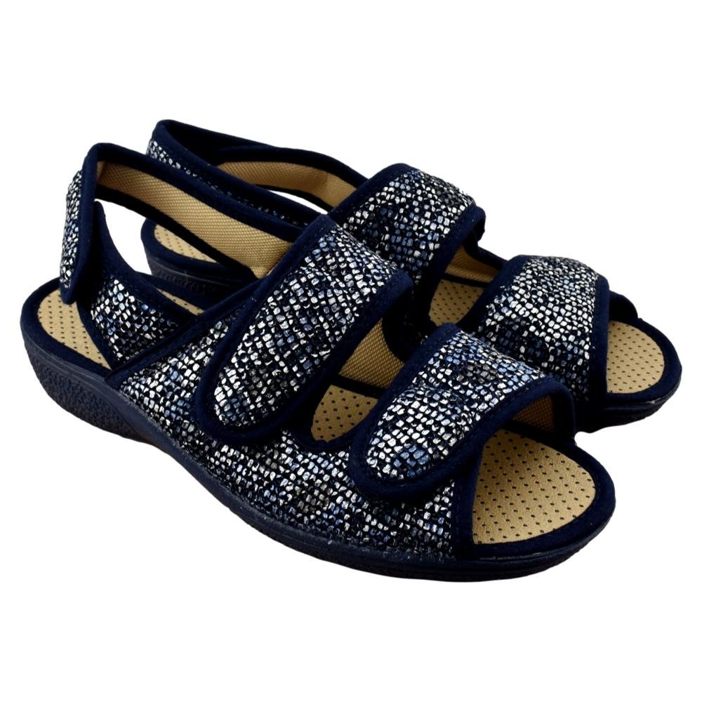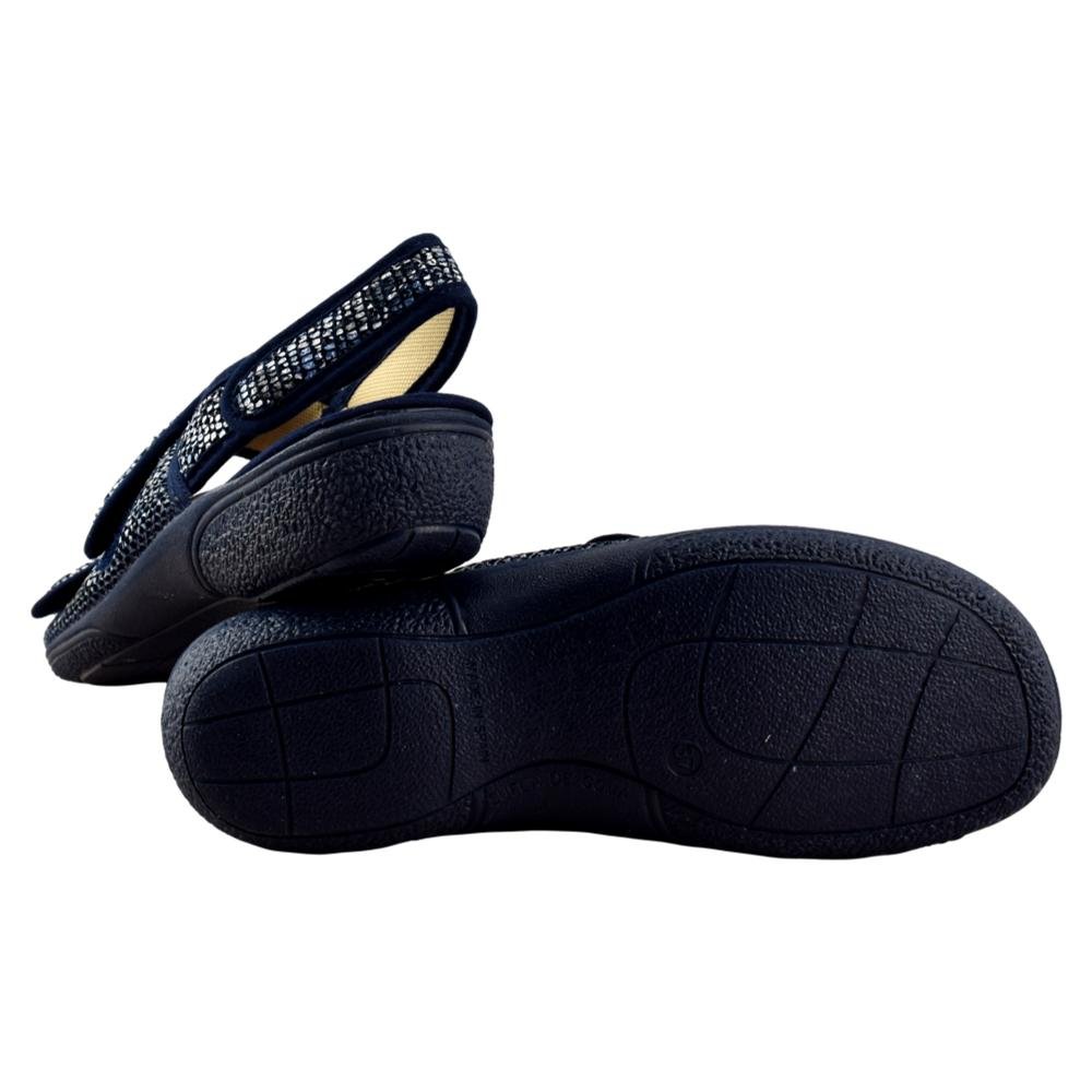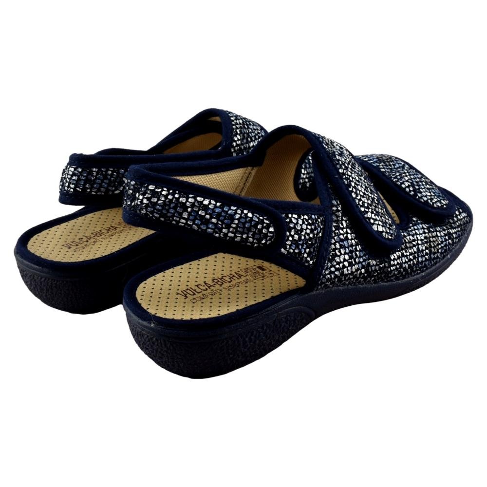 FABRICADO EN ESPAÑA. Zapatilla con forro muy suave, con 3 tiras adhesivas que se adaptan perfectamente a cualquier pie. Ideal para pies anchos y delicados. Piso de goma flexible y antideslizante.