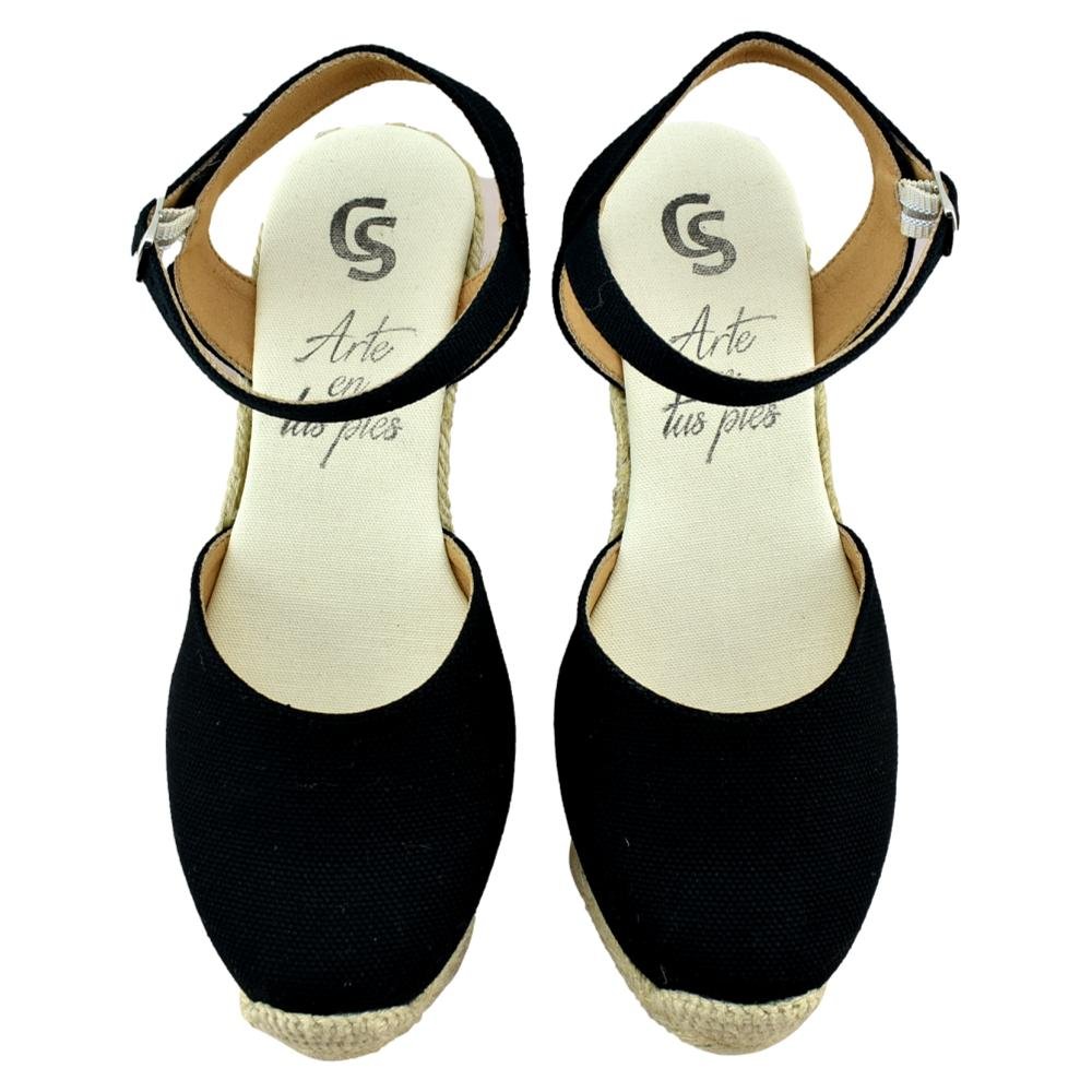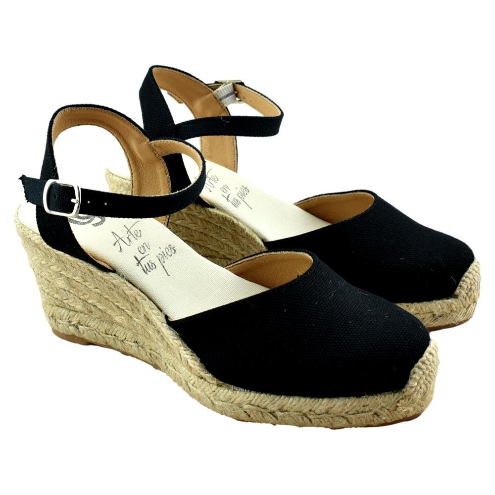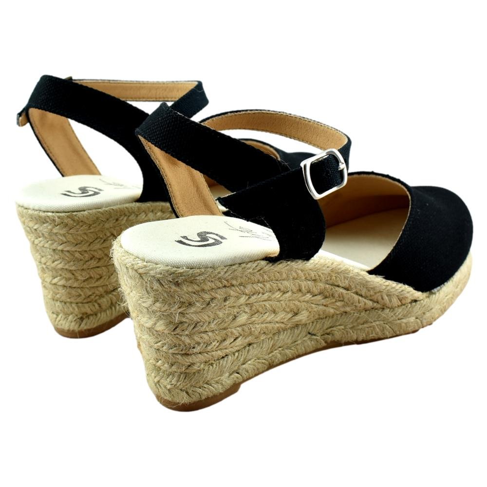 FABRICADO EN ESPAÑA. Alpargata de lona con cuña de esparto de 5 cuerdas. Tira al tobillo con cierre de hebilla.