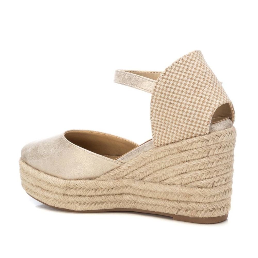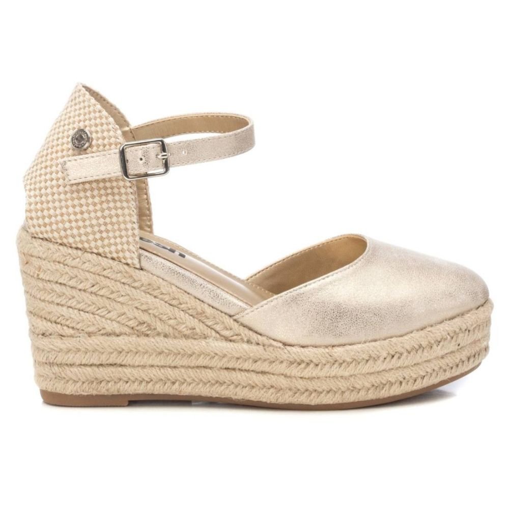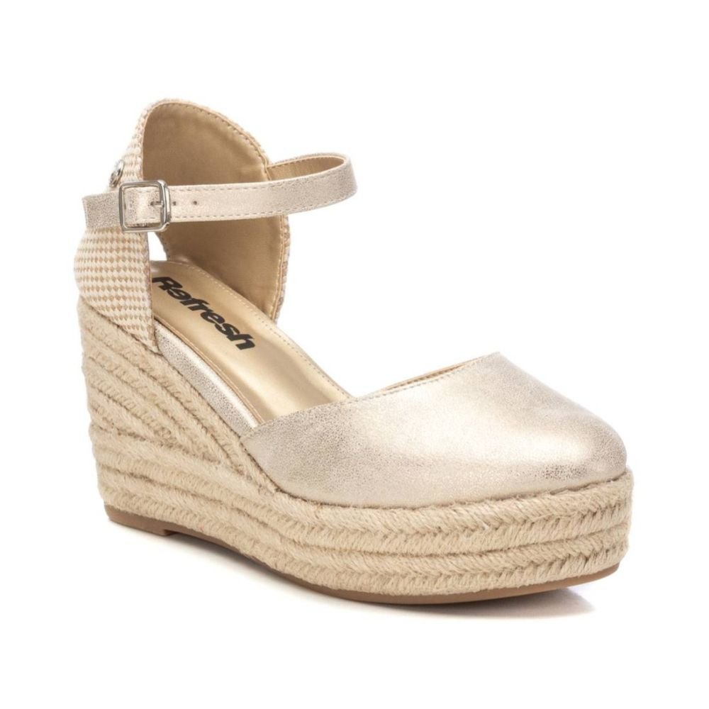 Alpargata de mujer tipo valenciana, de la marca Refresh. Fabricada en material sintético. Correa al tobillo con hebilla. Cuña de 8 cm de yute con suela de goma antideslizante. Una alpargata con colores metalizados en tendencia ideal para esta temporada. Este modelo ha obtenido el certificado vegano por la organización mundial PETA (Organización de los derechos de los animales).