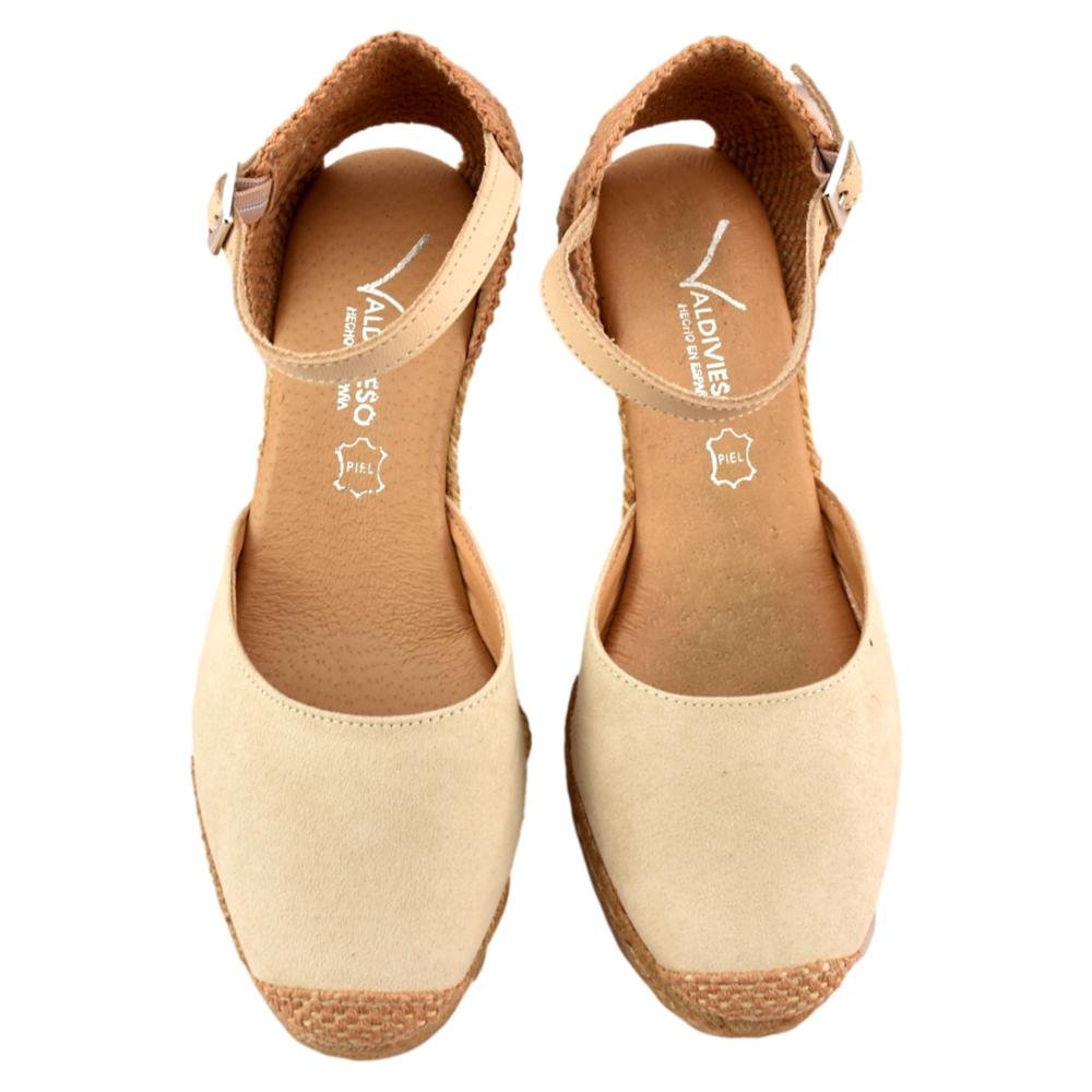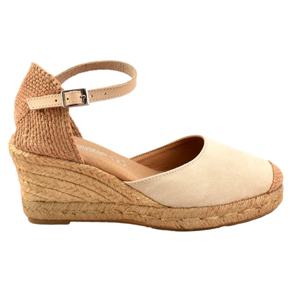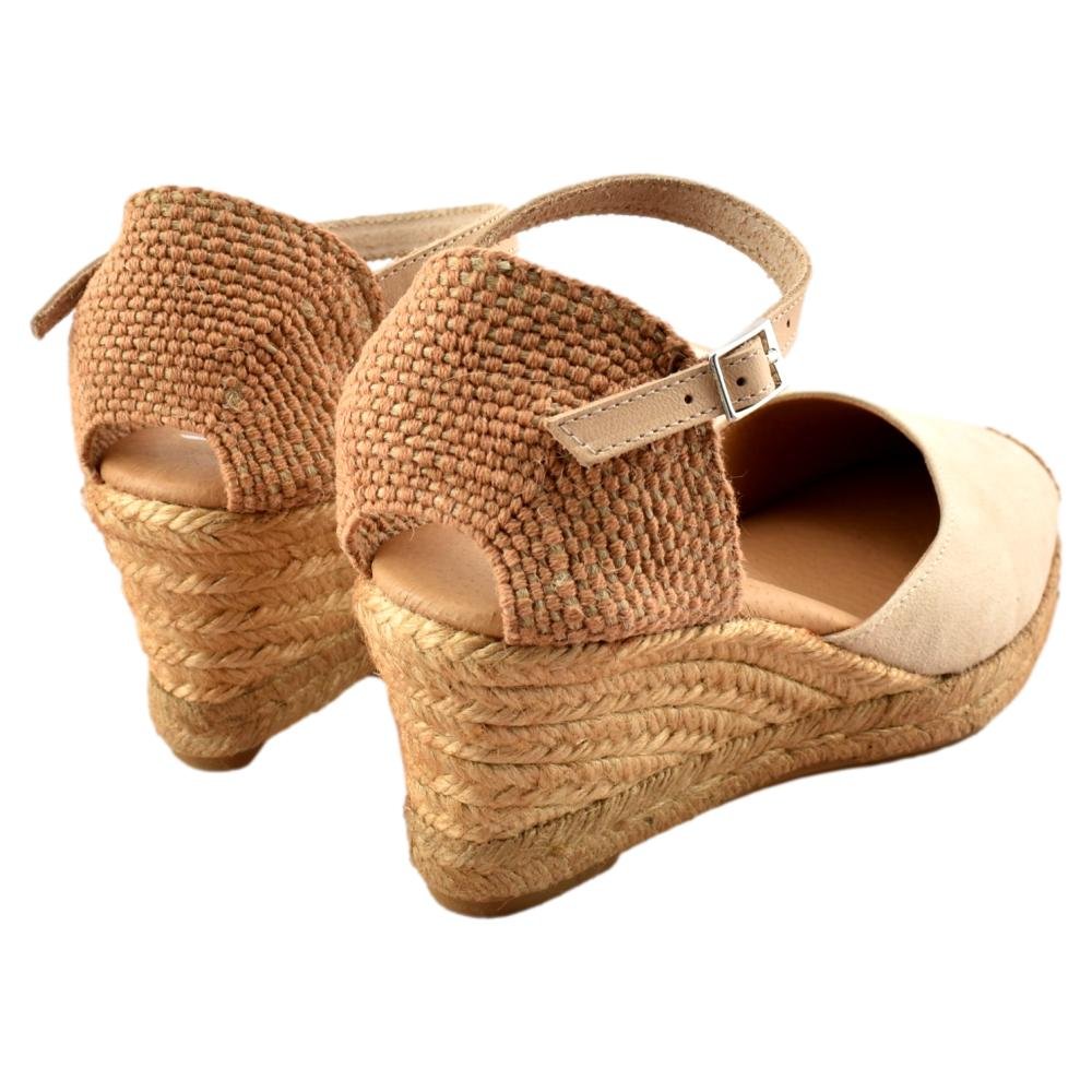 FABRICADO EN ESPAÑA. Zapatillas de esparto con altura de 5 cuerdas más plataforma ( 7 cm). Planta de gel muy cómoda. El tejido empleado es serratex con la puntera bordada. Talonera cerrada con pulsera al tono y cierre de hebilla.