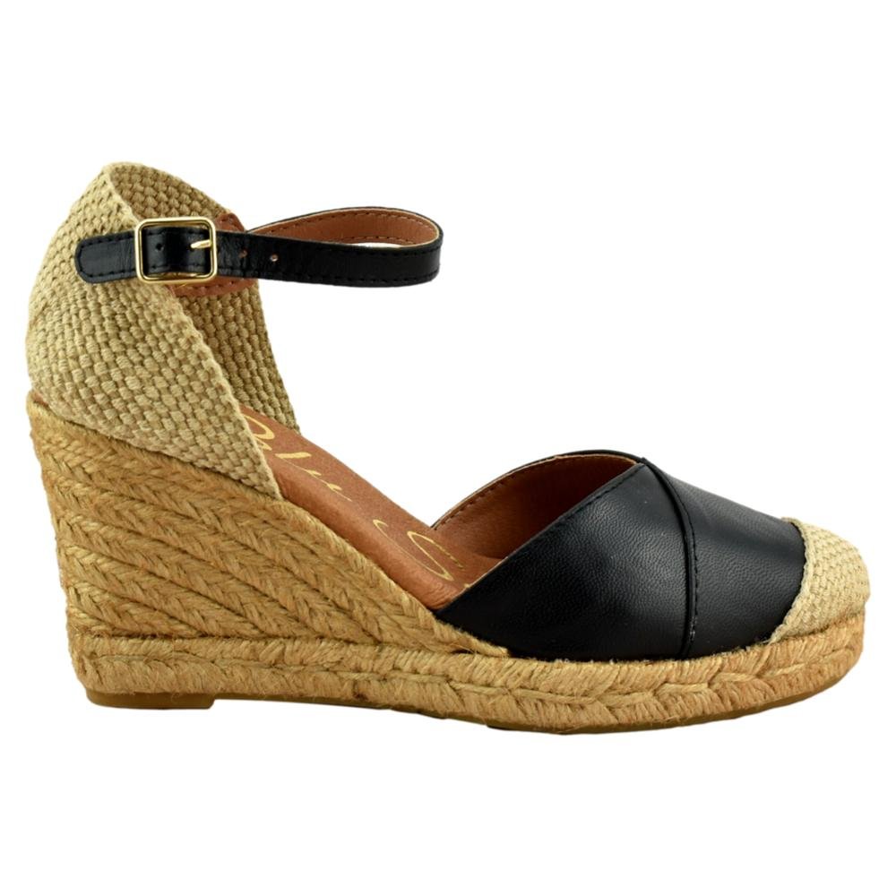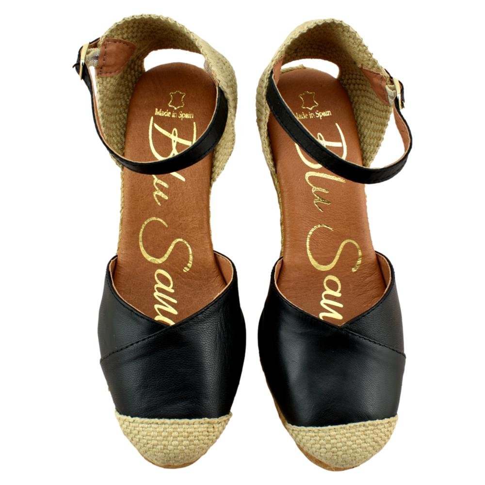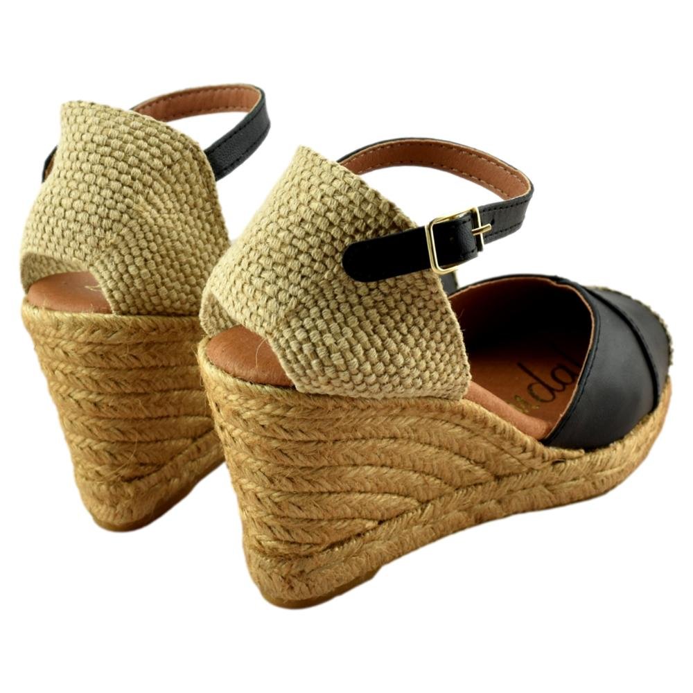 FABRICADO EN ESPAÑA. Cuñas de esparto de 7 cuerdas de altura más la plataforma, 9cm en total. Fabricadas en piel con planta de gel, muy cómodas. Tira al tobillo con cierre de hebilla.