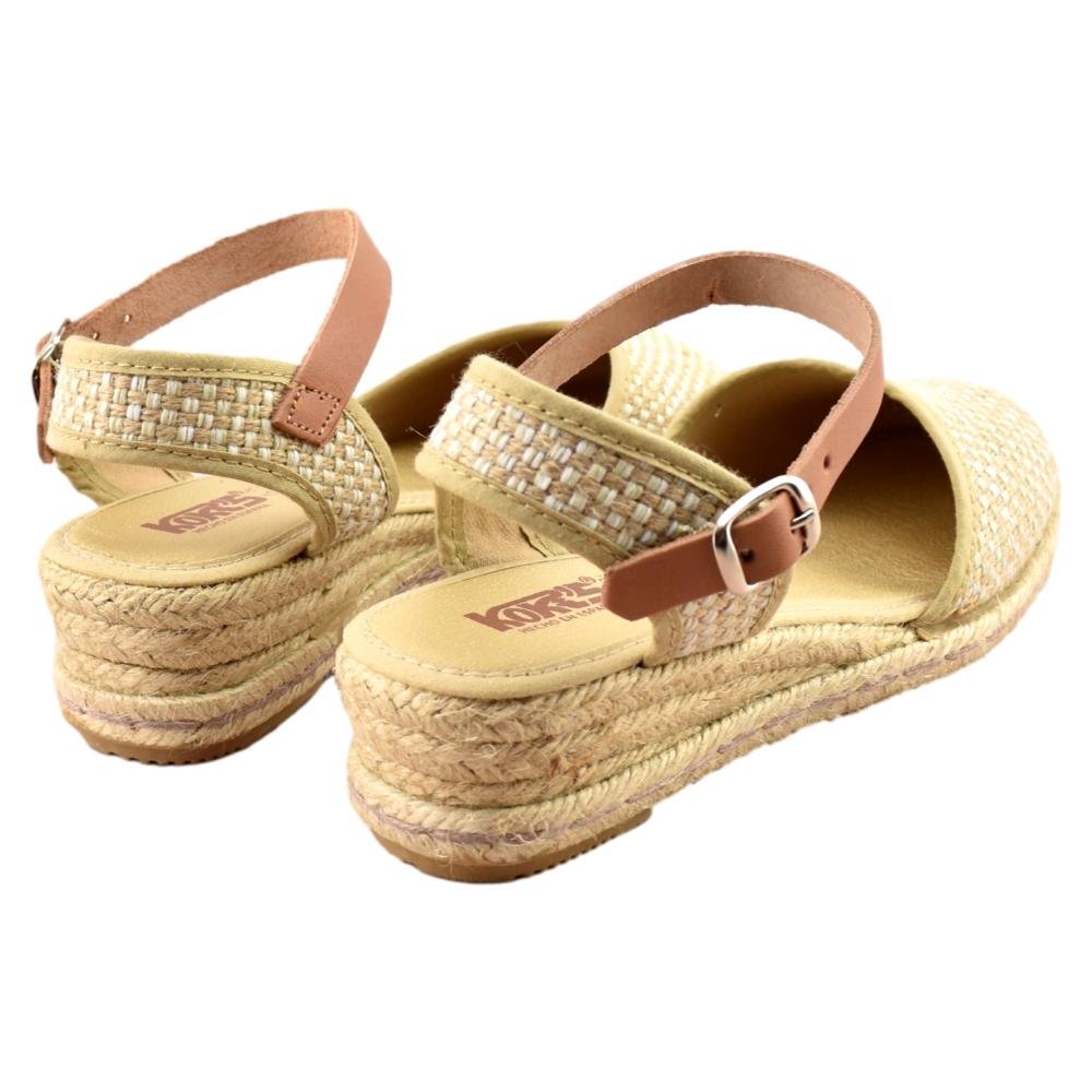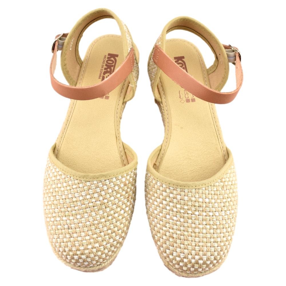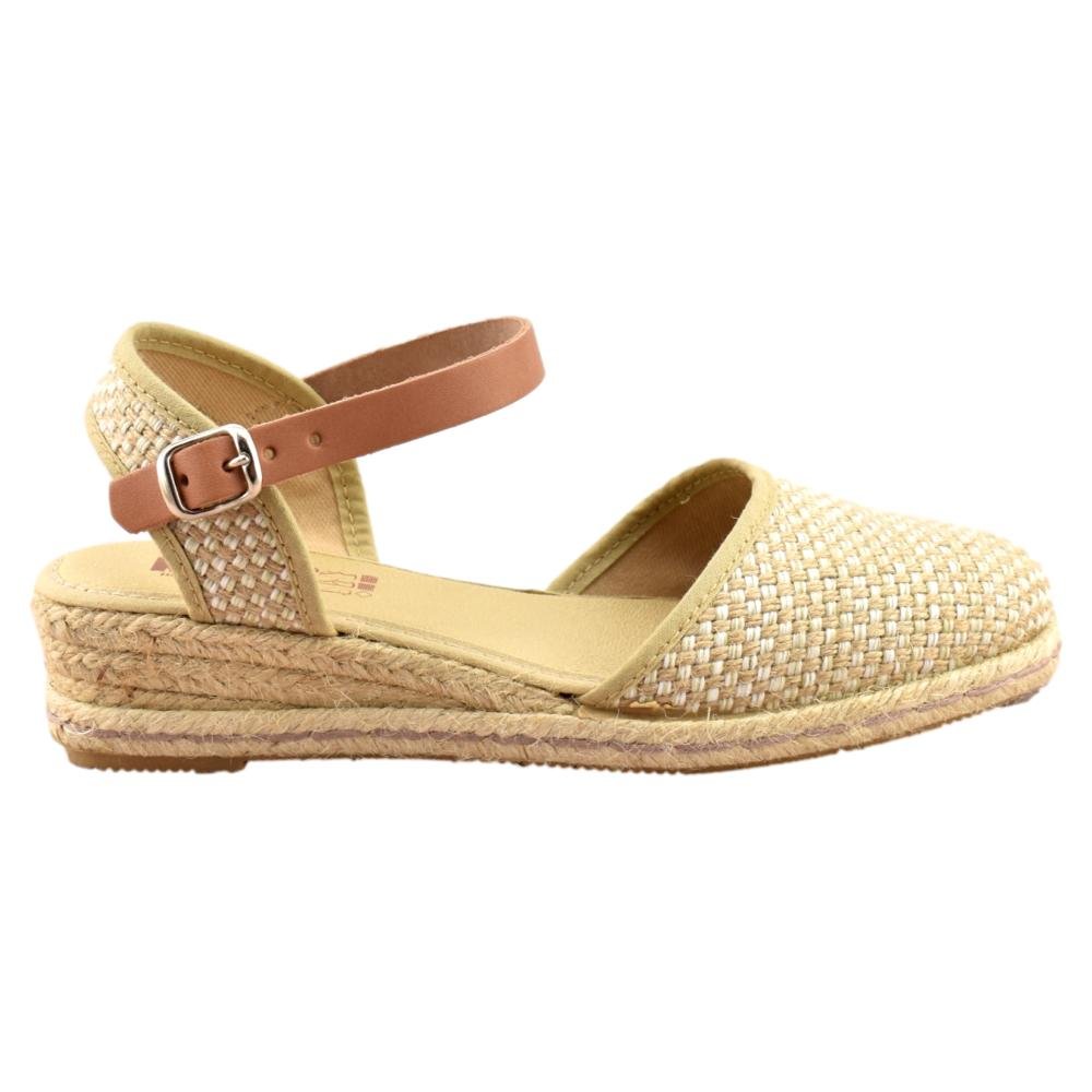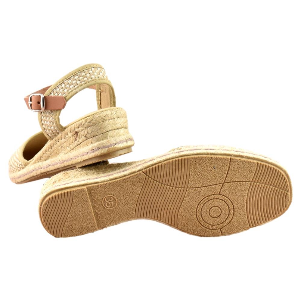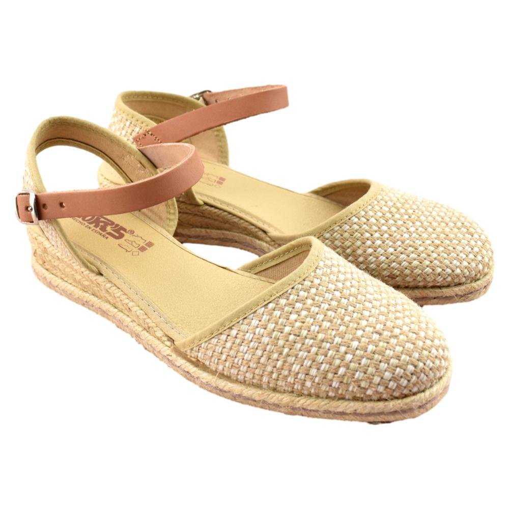 FABRICADO EN ESPAÑA. Zapatillas de esparto de 2 cuerdas y 4cm de altura. Pala textil en color beig y correa cuero al tobillo con cierre de hebilla. Piso flexible y plantilla acolchada.