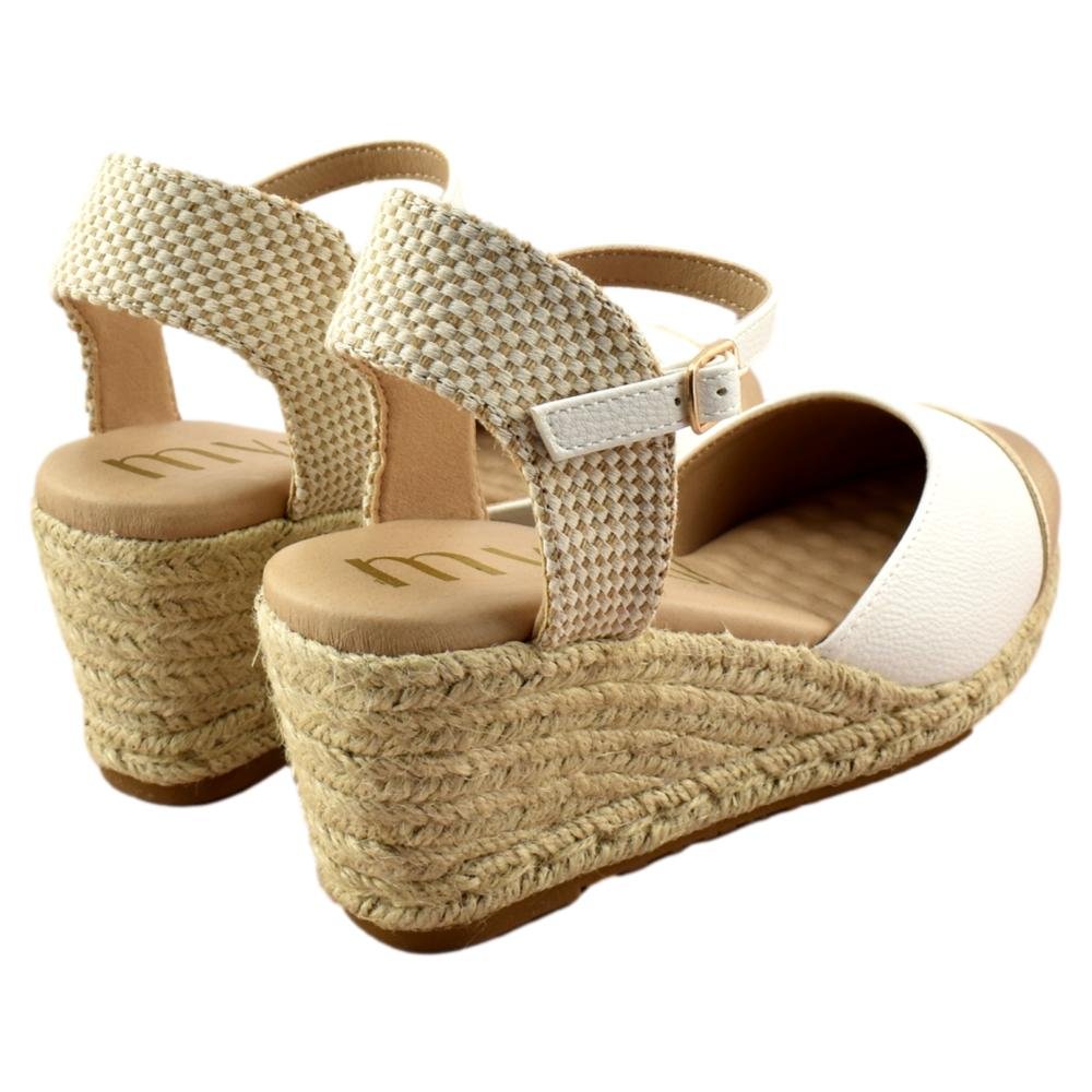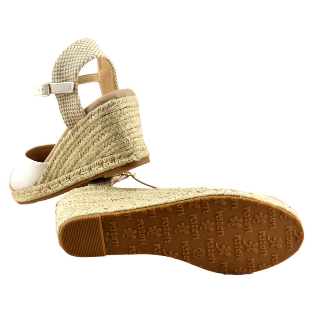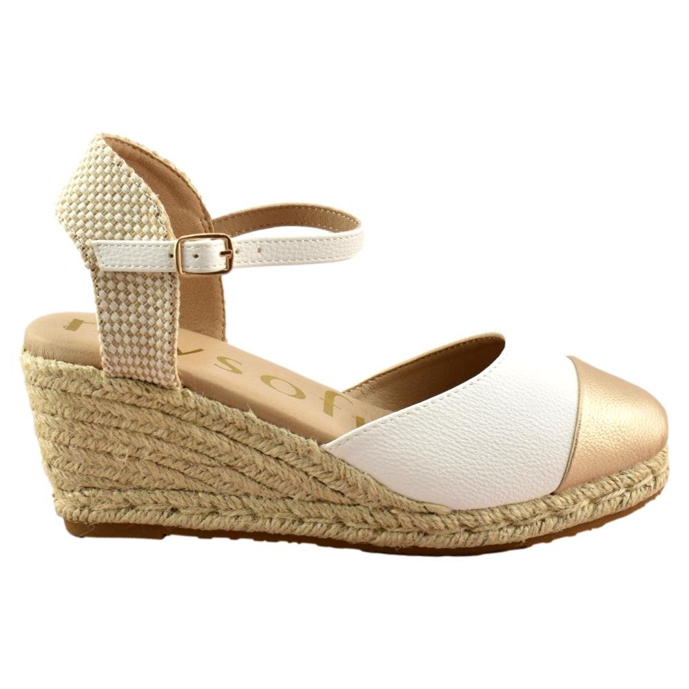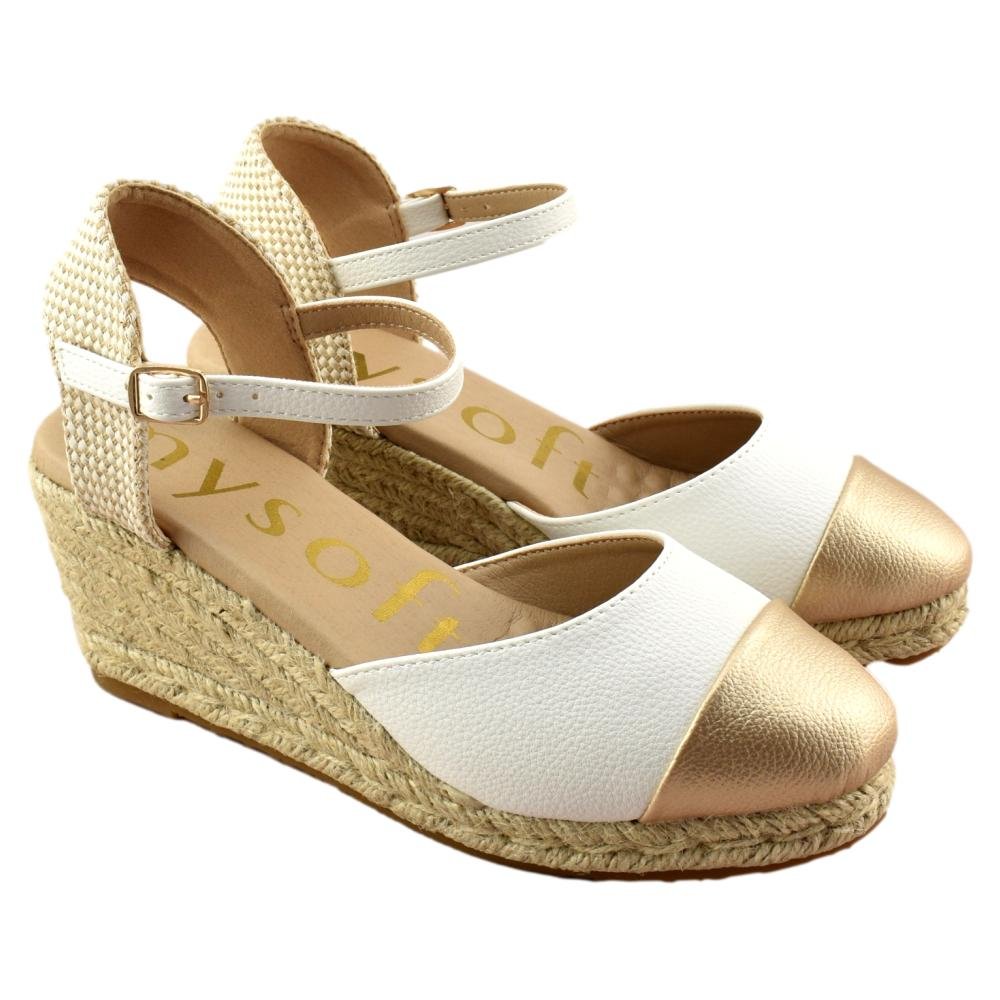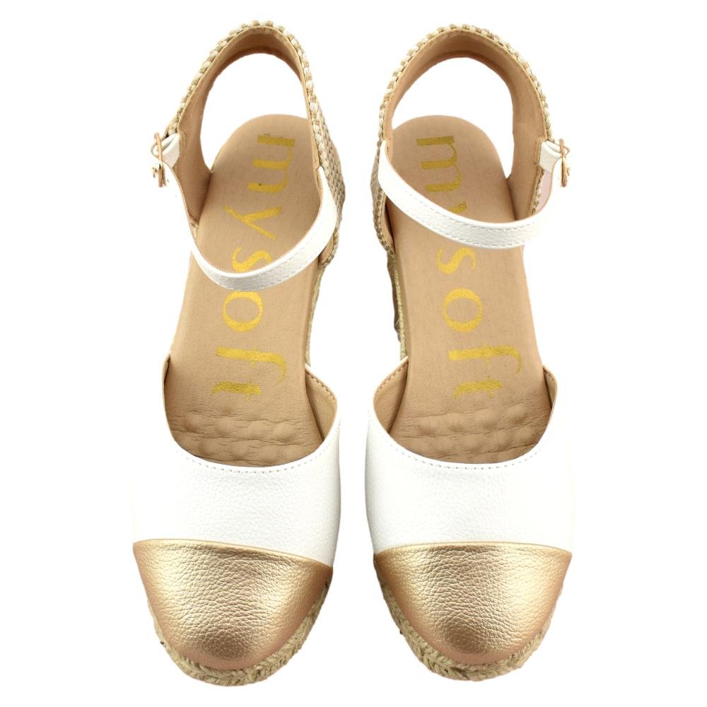 Esparteñas para mujer, bicolor en blanco y oro, cierre de hebilla al tobillo, talón descubierto y puntera cerrada. Plantilla de gel super suave para mayor comodidad. Fabricadas por MySoft.