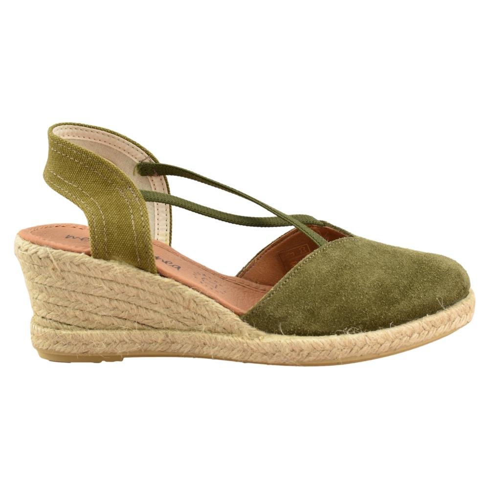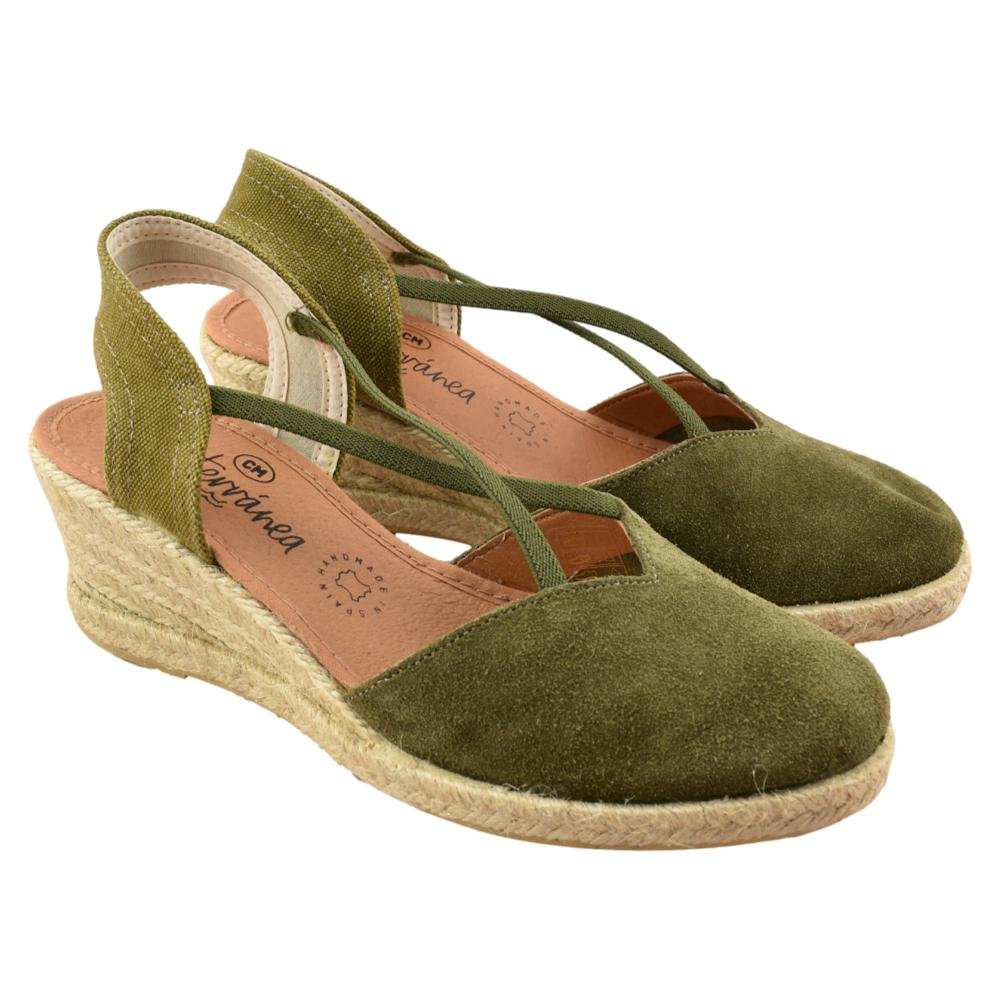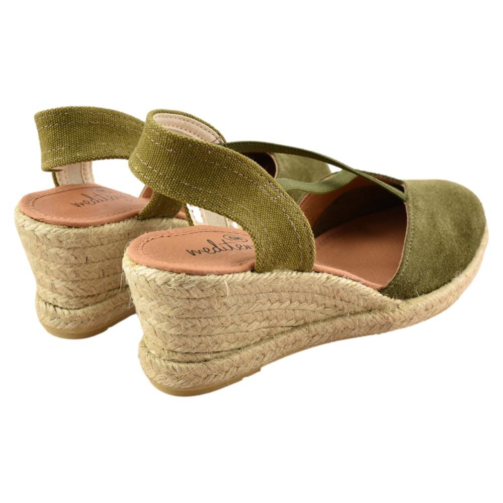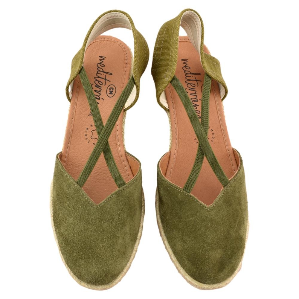 FABRICADO EN ESPAÑA. Alpargata de esparto con cuña de 7cm. Piso de goma flexible y plantilla de piel acolchada. Fabricada en piel de serraje en color verde con elásticos cruzados en el empeine que aportan máxima sujeción y comodidad.