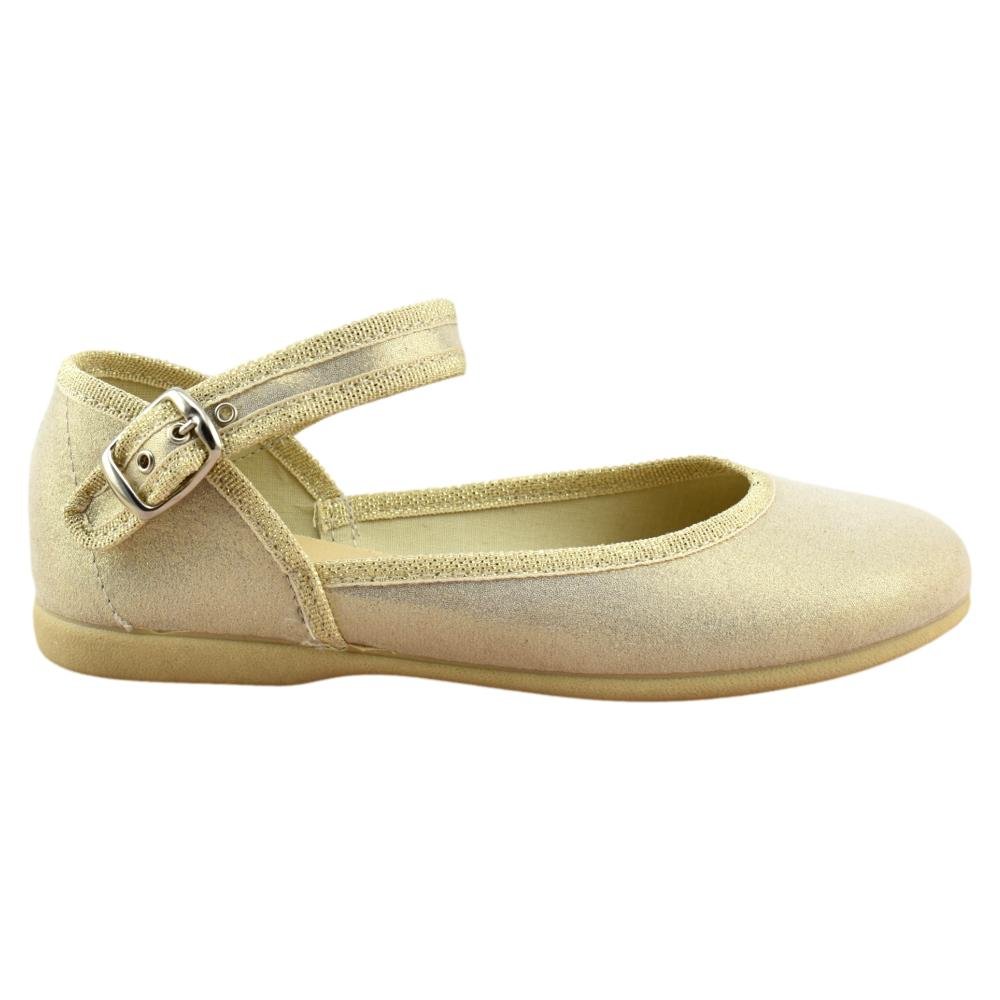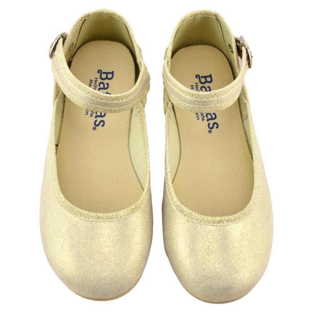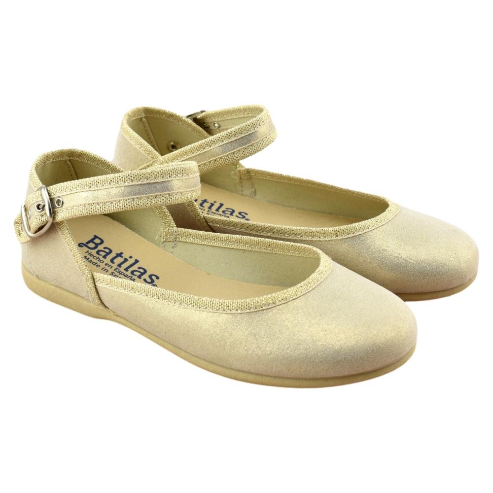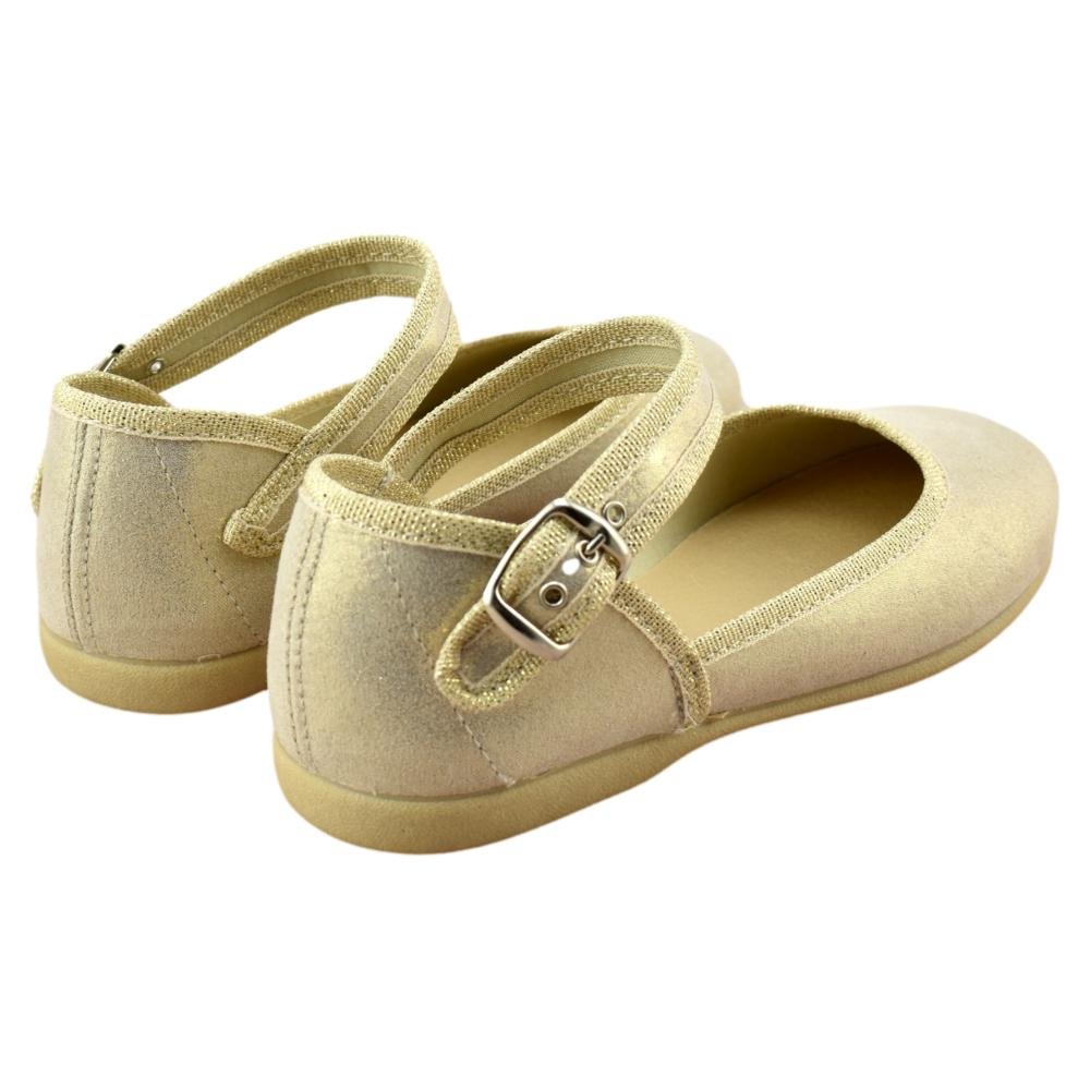 FABRICADO EN ESPAÑA. Mercedes de lona metalizada con tira al tobillo y cierre de hebilla. Piso de goma flexible y antideslizante.