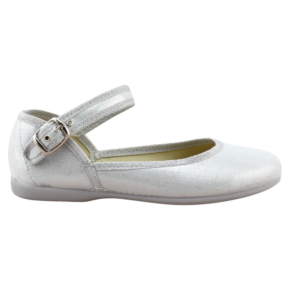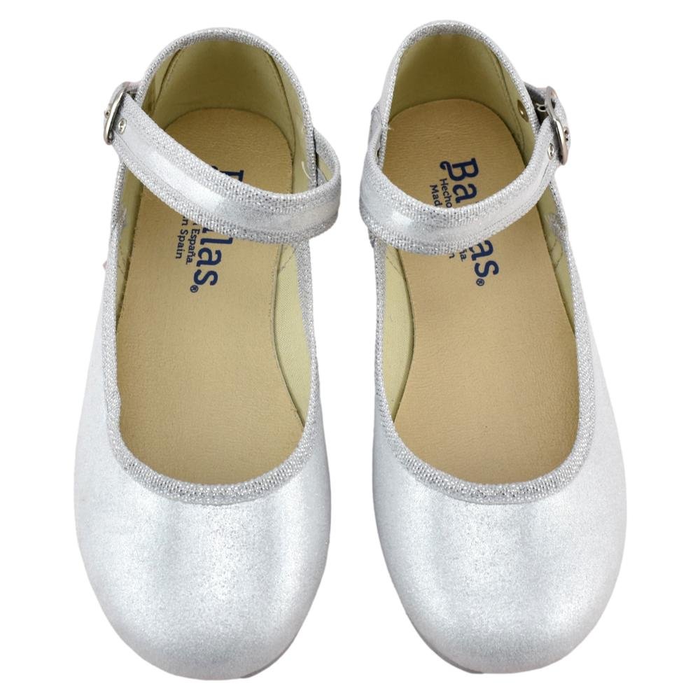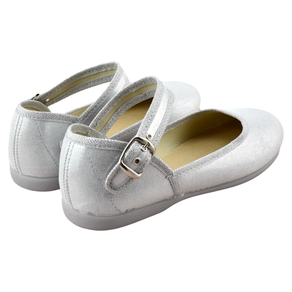 FABRICADO EN ESPAÑA. Mercedes de lona metalizada con tira al tobillo y cierre de hebilla. Piso de goma flexible y antideslizante.