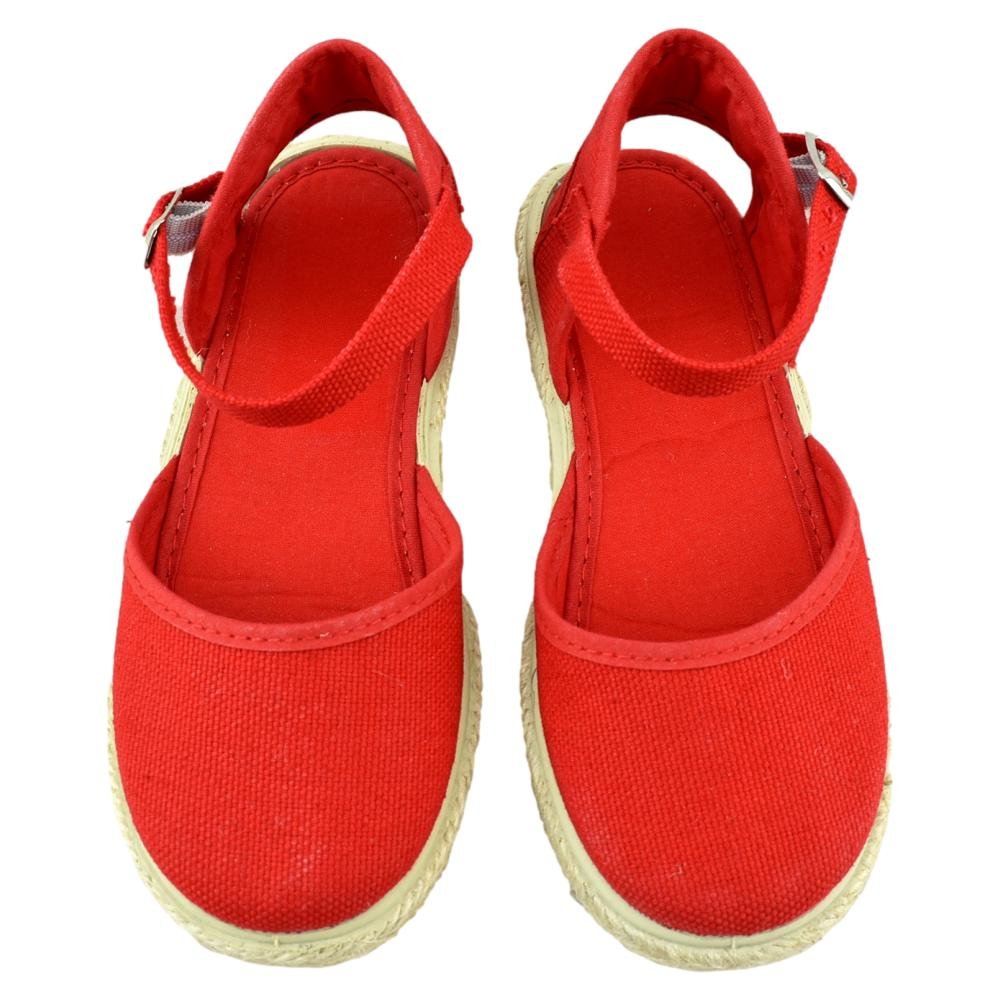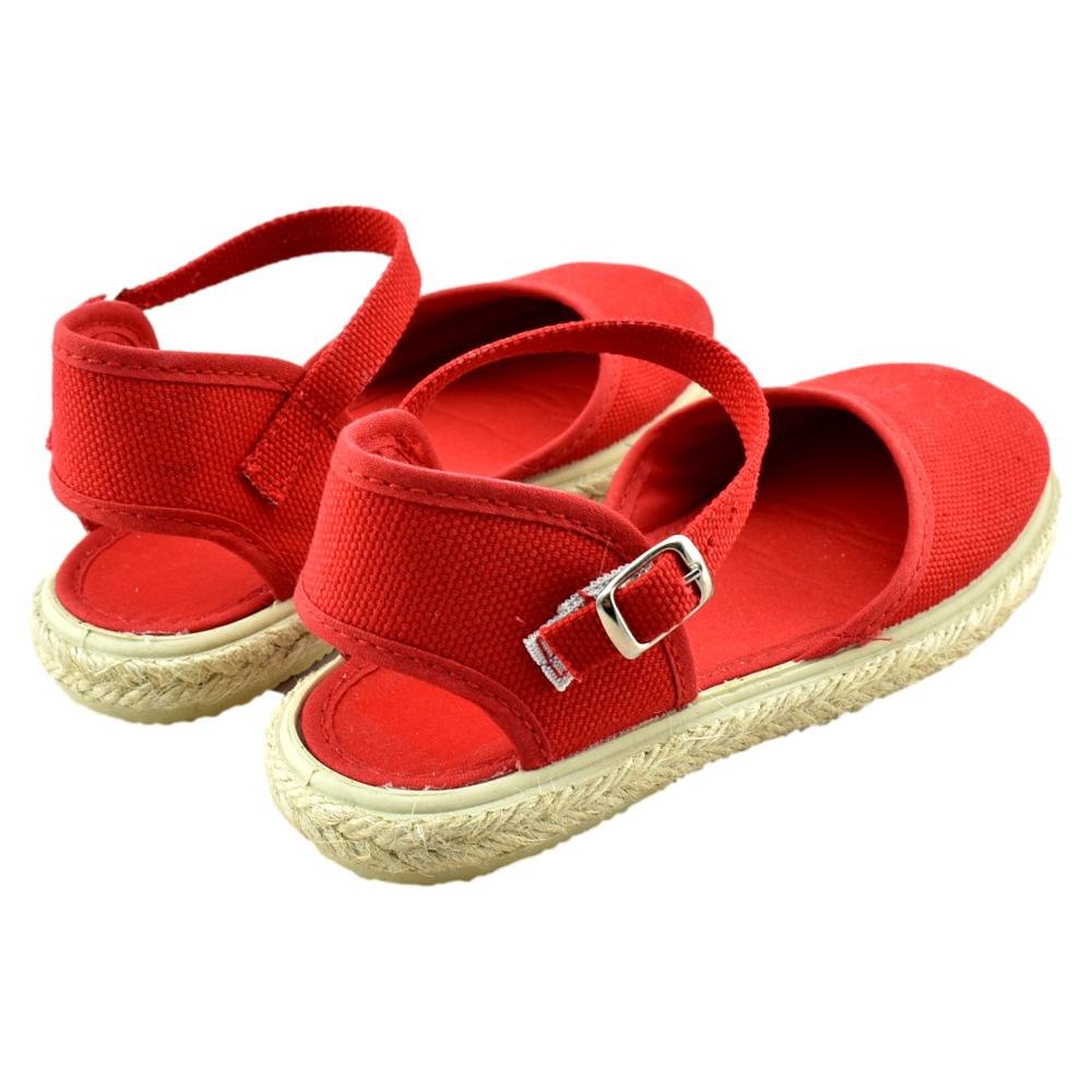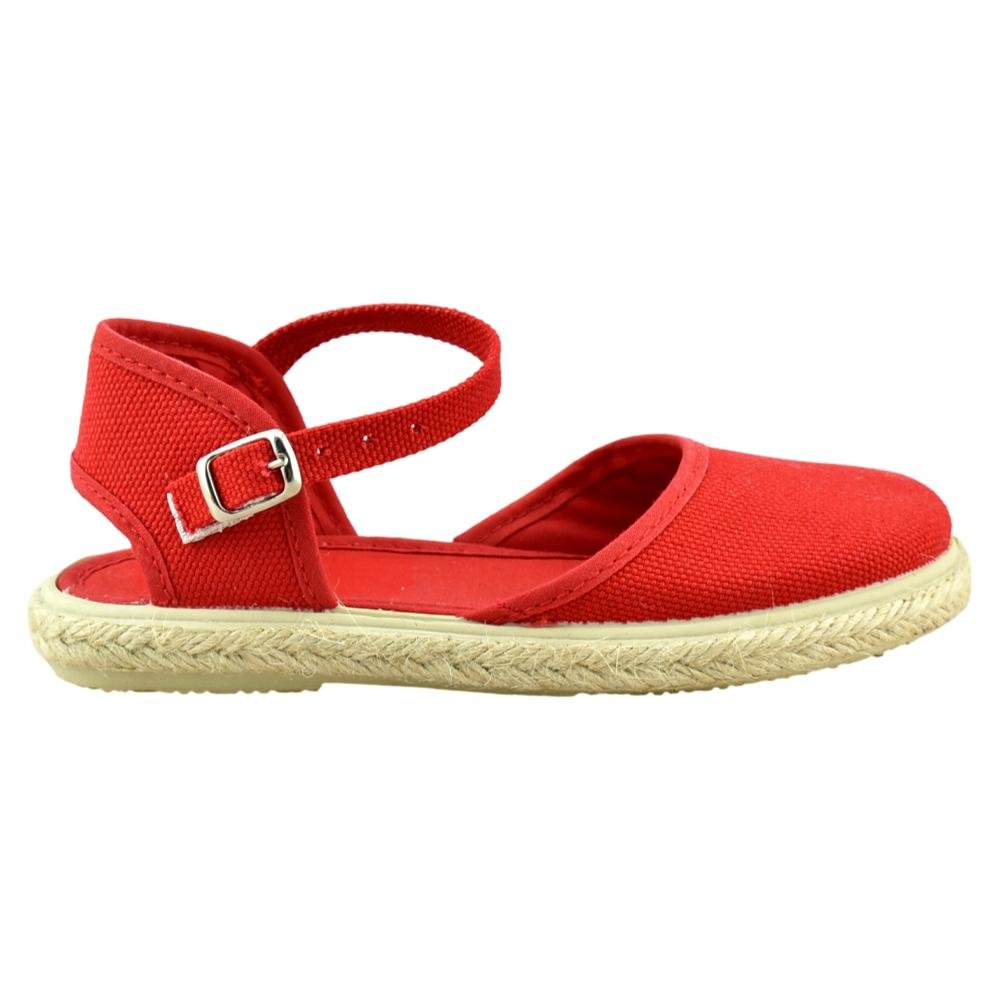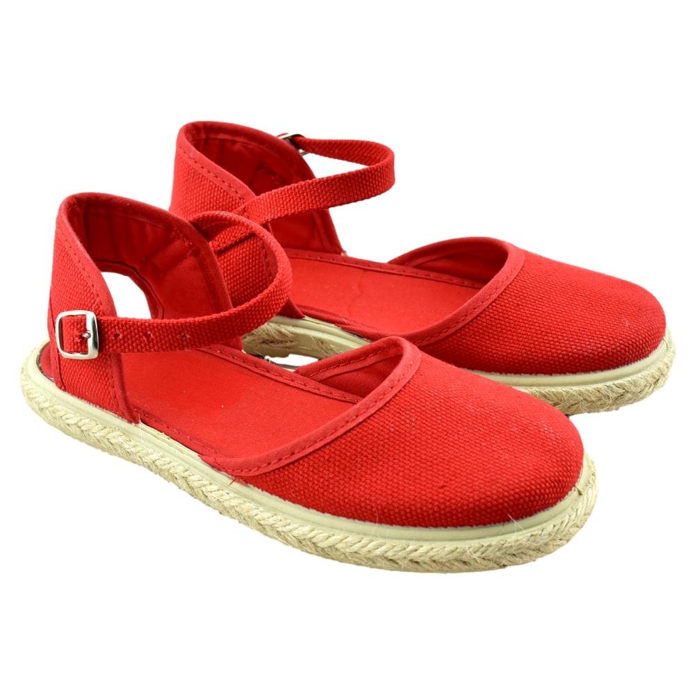 FABRICADO EN ESPAÑA. Zapatilla de lona con piso flexible de goma con ribete de yute. Cierre de hebilla.