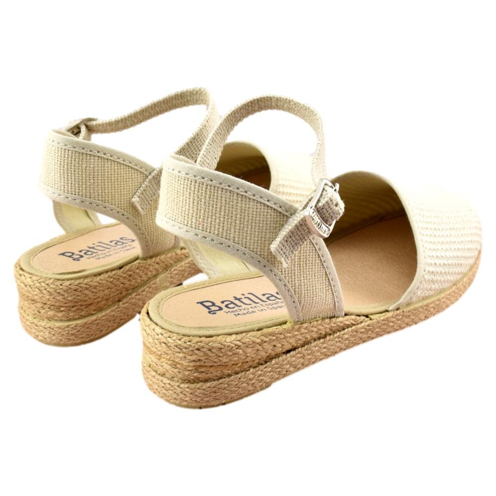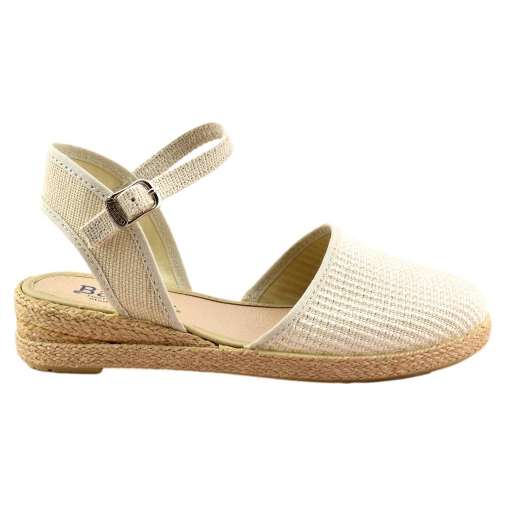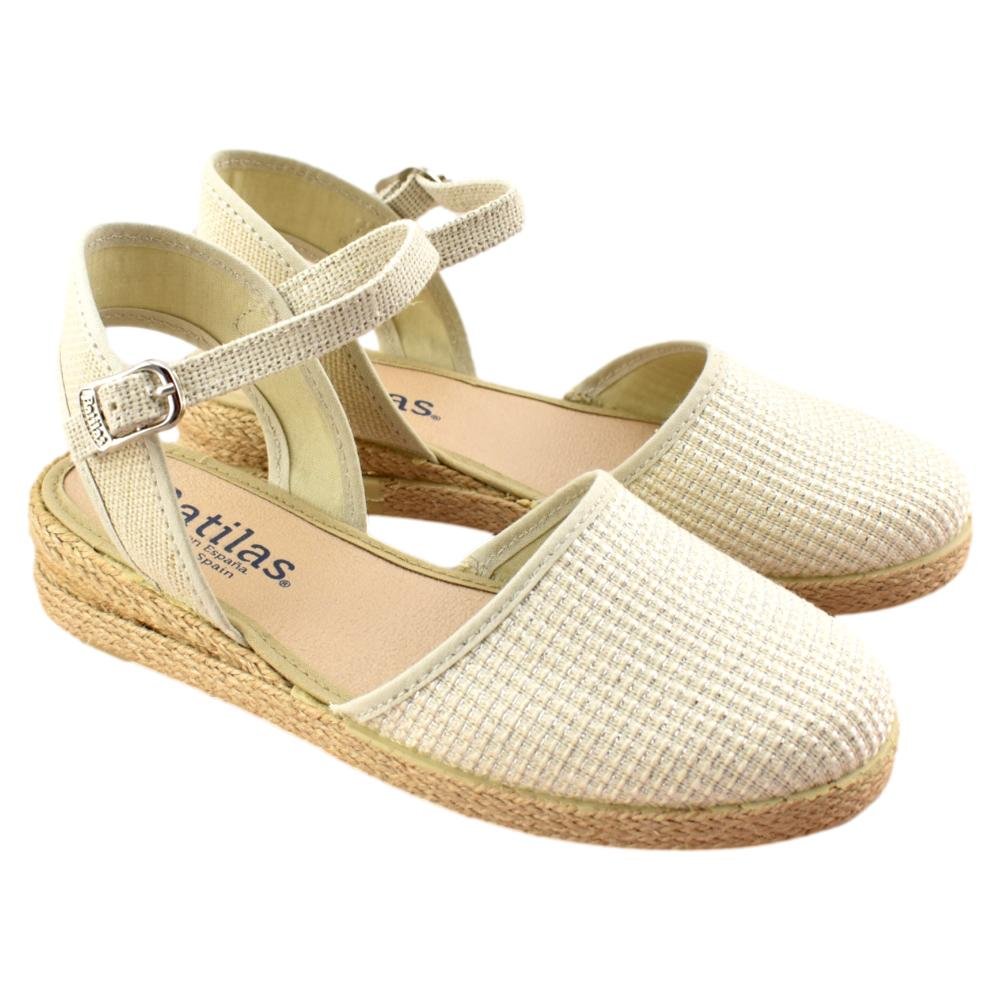 FABRICADO EN ESPAÑA. Valenciana con correa y cierre de hebilla. Corte en tejido beig metalizado y piso de caucho natural vulcanizado.