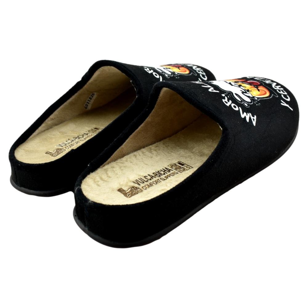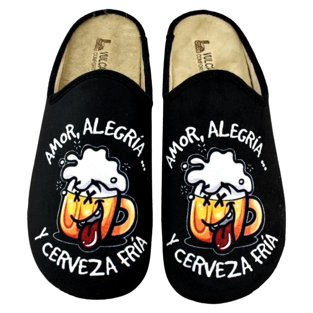 FABRICADO EN ESPAÑA. Zapatilla con motivo «amor, alegría y cerveza fria» y jarras de cerveza. Plantilla acolchada extraíble. Tejido muy suave y cálido. Piso de goma flexible.