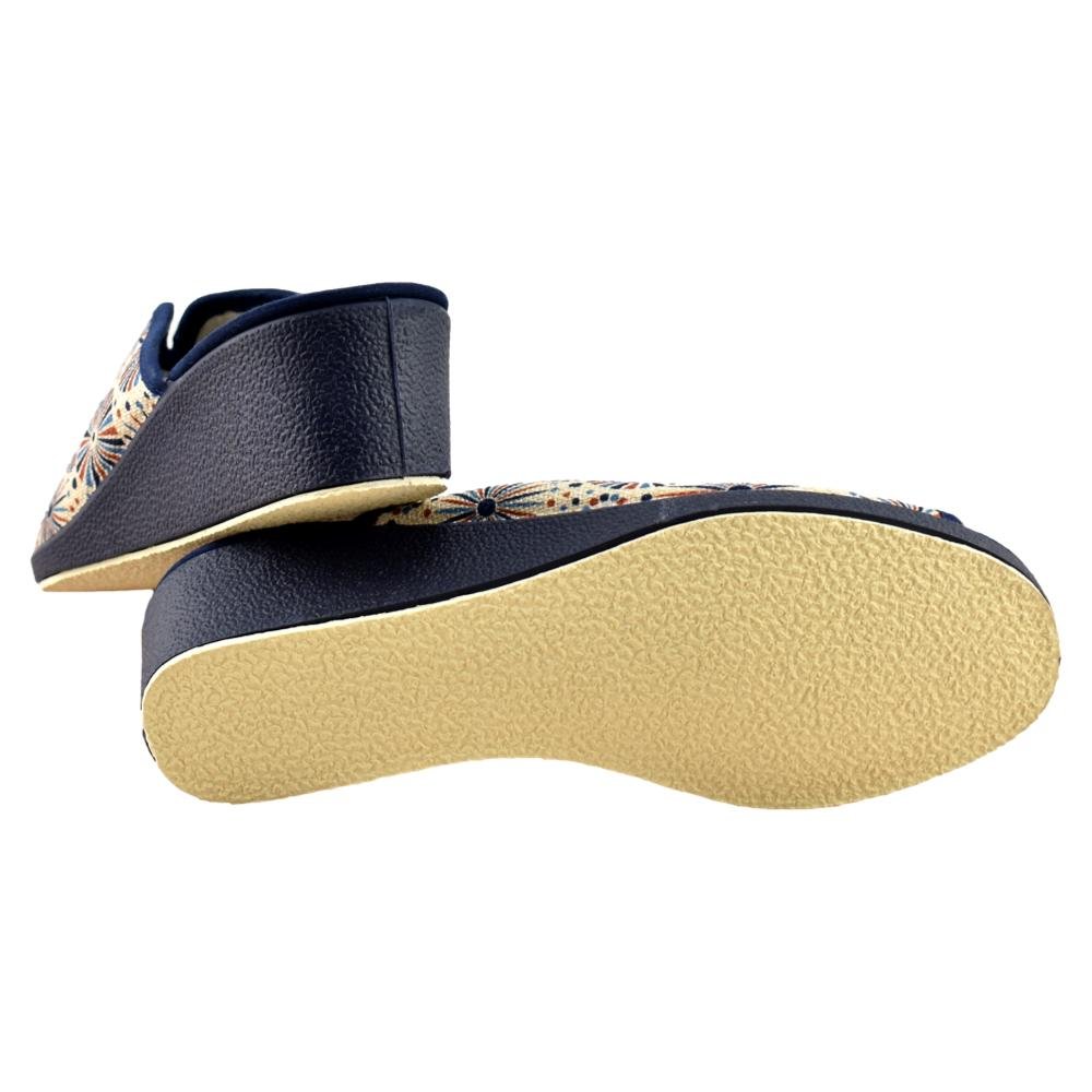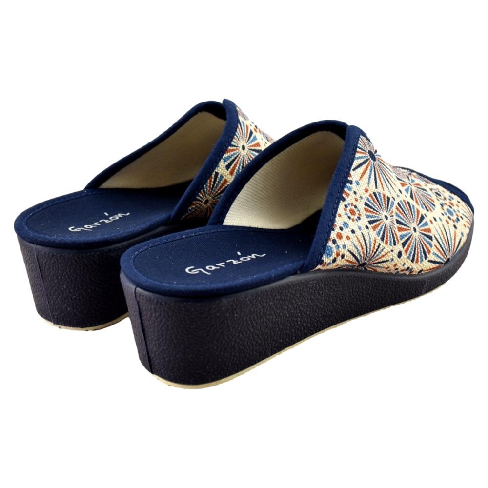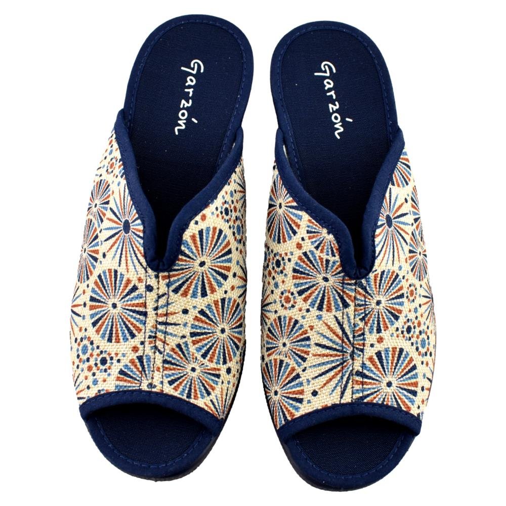 FABRICADO EN ESPAÑA. Zapatillas de casa con talón abierto y dedos fuera con cuña de 5,5cm, de color azul , tiene abertura en el empeine ideal para pies anchos, con forro interior en textil y suela de goma antideslizante. Chinela Ideal para mantener tus pies frescos en verano. Piso con grabado especial rugoso para evitar posibles deslizamientos. Fabricada con tejidos en microfibras y algodón que permiten una constante ventilación. Relleno de corcho natural para una total absorción de los posibles impactos. Respetuosos con la naturaleza. Utilizando materiales que cuidan al máximo posible el medio ambiente.