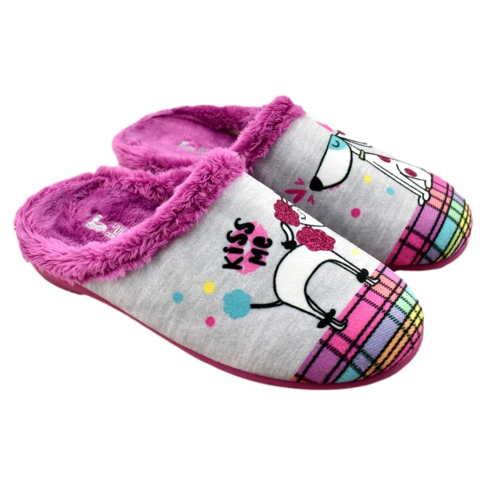 FABRICADO EN ESPAÑA. Zapatillas de casa con forro muy suave y cálido. Piso de goma flexible y plantilla acolchada extraíble. Divertido diseño de perritos.