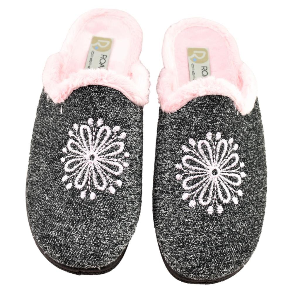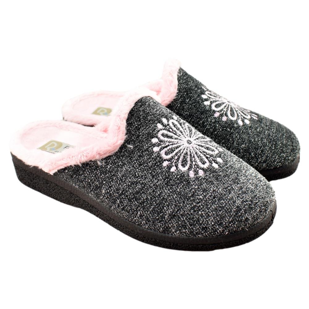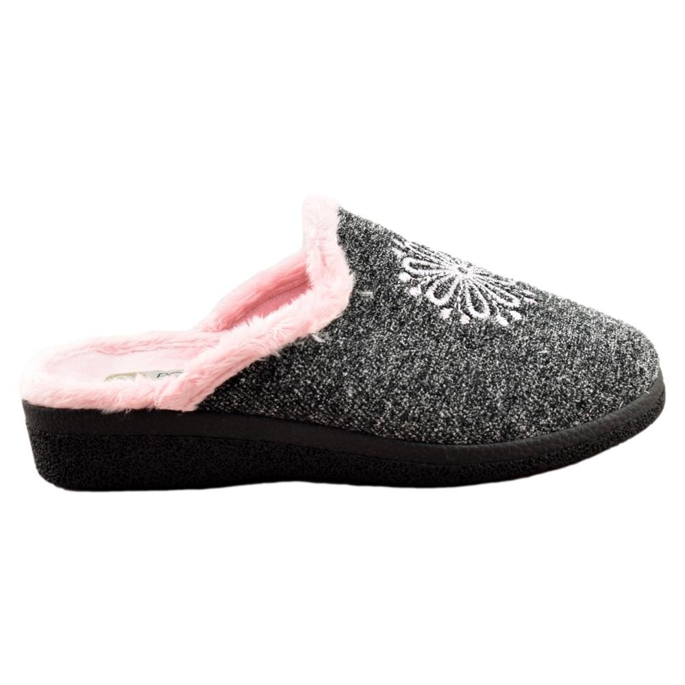 FABRICADO EN ESPAÑA. Zapatilla de casa para mujer con piso antideslizante. Forro muy agradable al tacto y cálido. Bordado delantero. Cuña de 3cm.