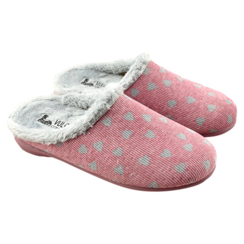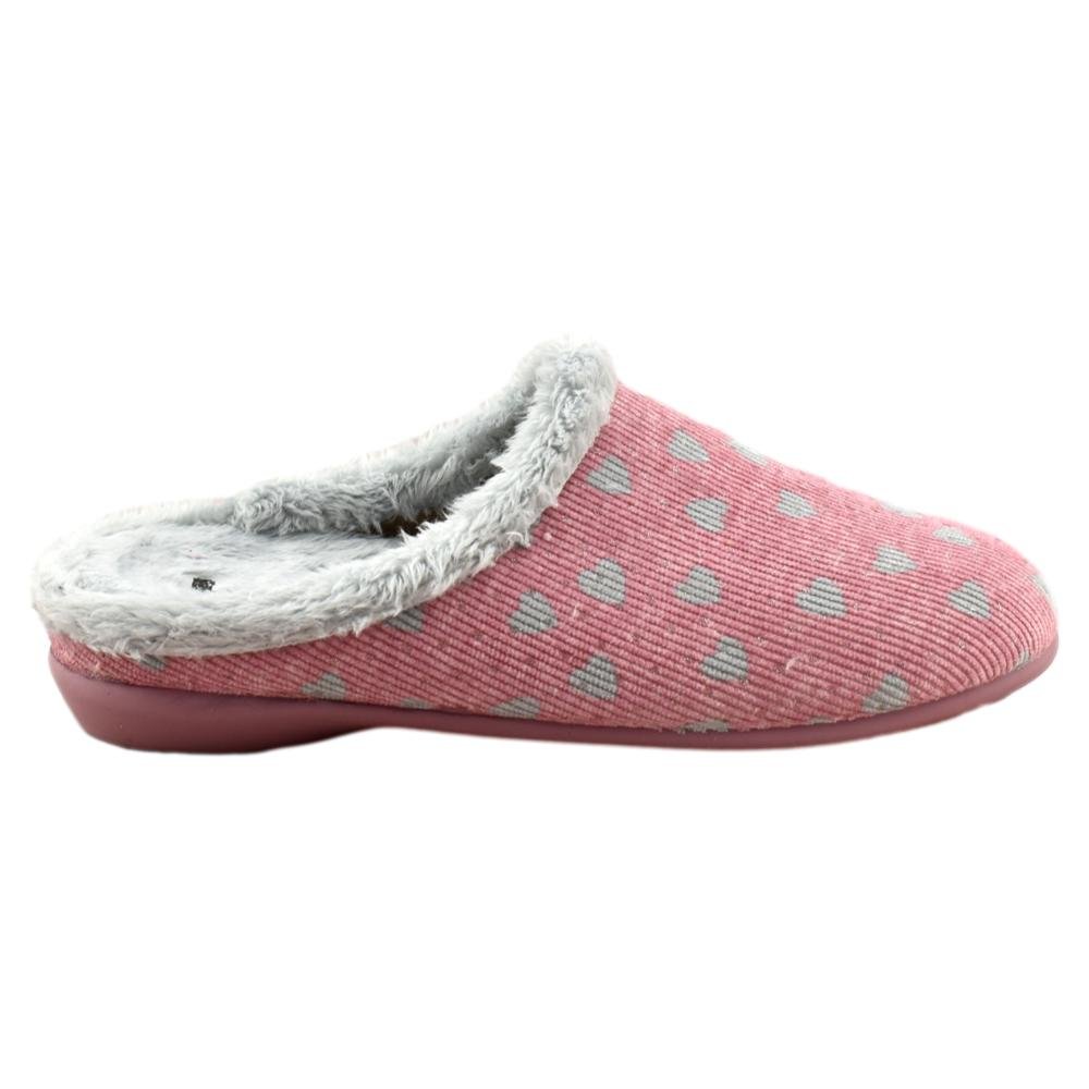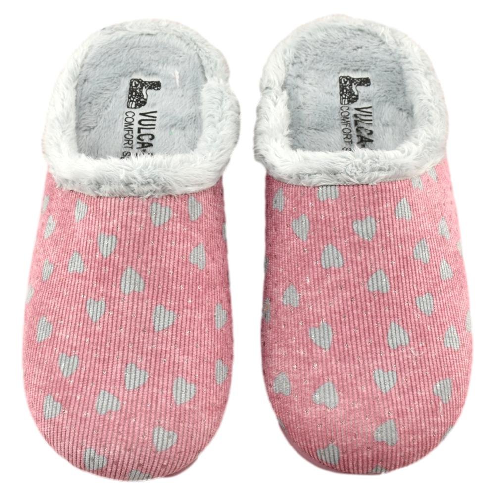FABRICADO EN ESPAÑA. Zapatillas destalonadas con forro muy suave y cálido. Diseño en color maquillaje con corazones. Piso de goma antideslizante y flexible.
