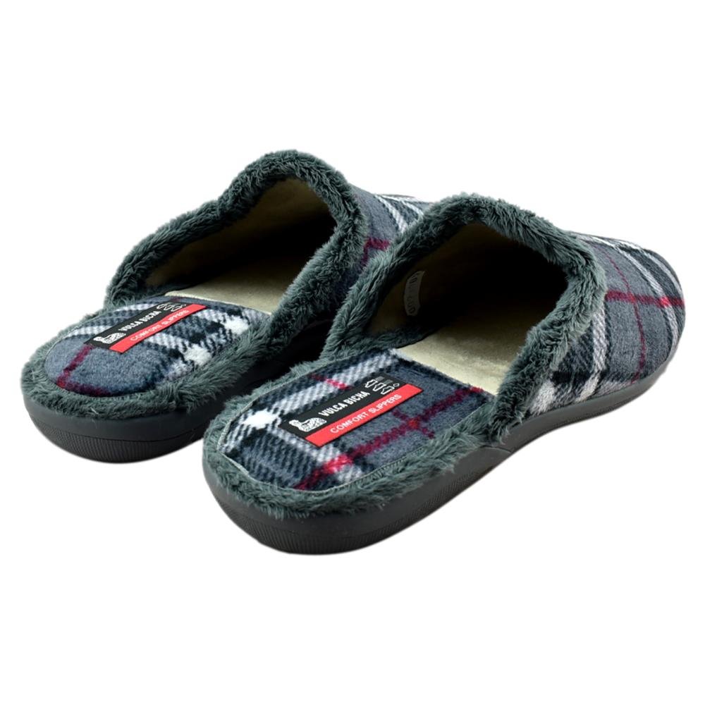 FABRICADO EN ESPAÑA. Zapatillas de casa de paño muy cálido y suave estampada en cuadros en tonos grises. Talón acolchado. Piso de caucho antideslizante y flexible que aporta gran comodidad en cada pisada.