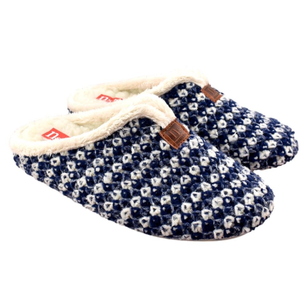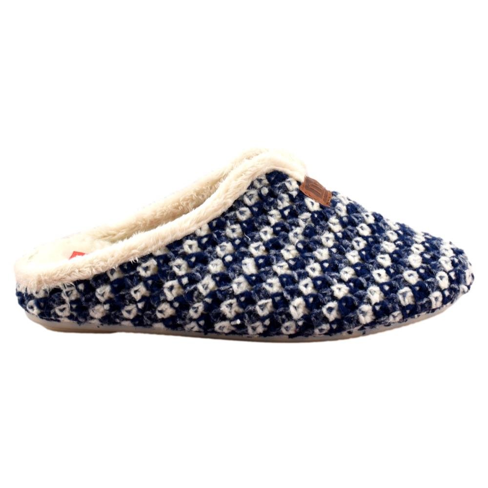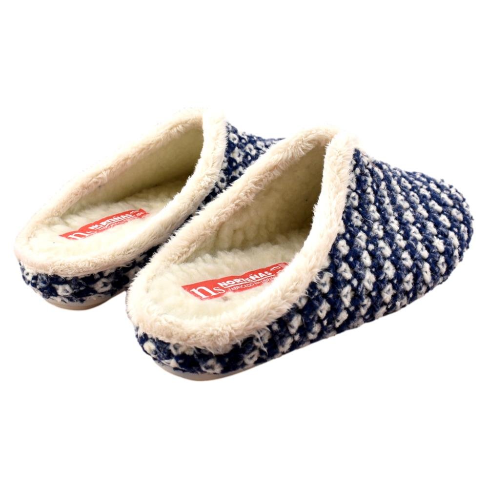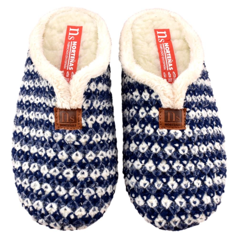FABRICADO EN ESPAÑA. Zapatillas de casa de lana trenzada bicolor en tonos azules. Interior y plantilla forradas de pelo, que aporta calidez y bienestar en los fríos días de invierno. Piso de goma flexible.
