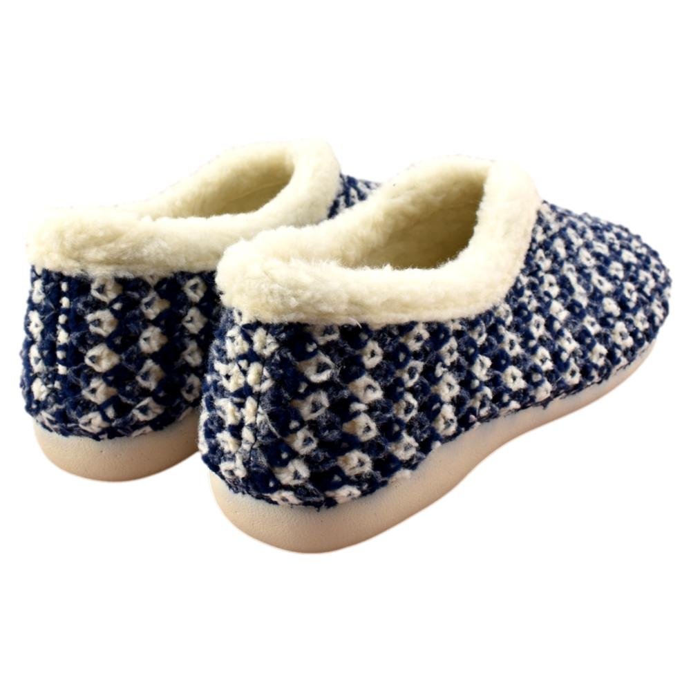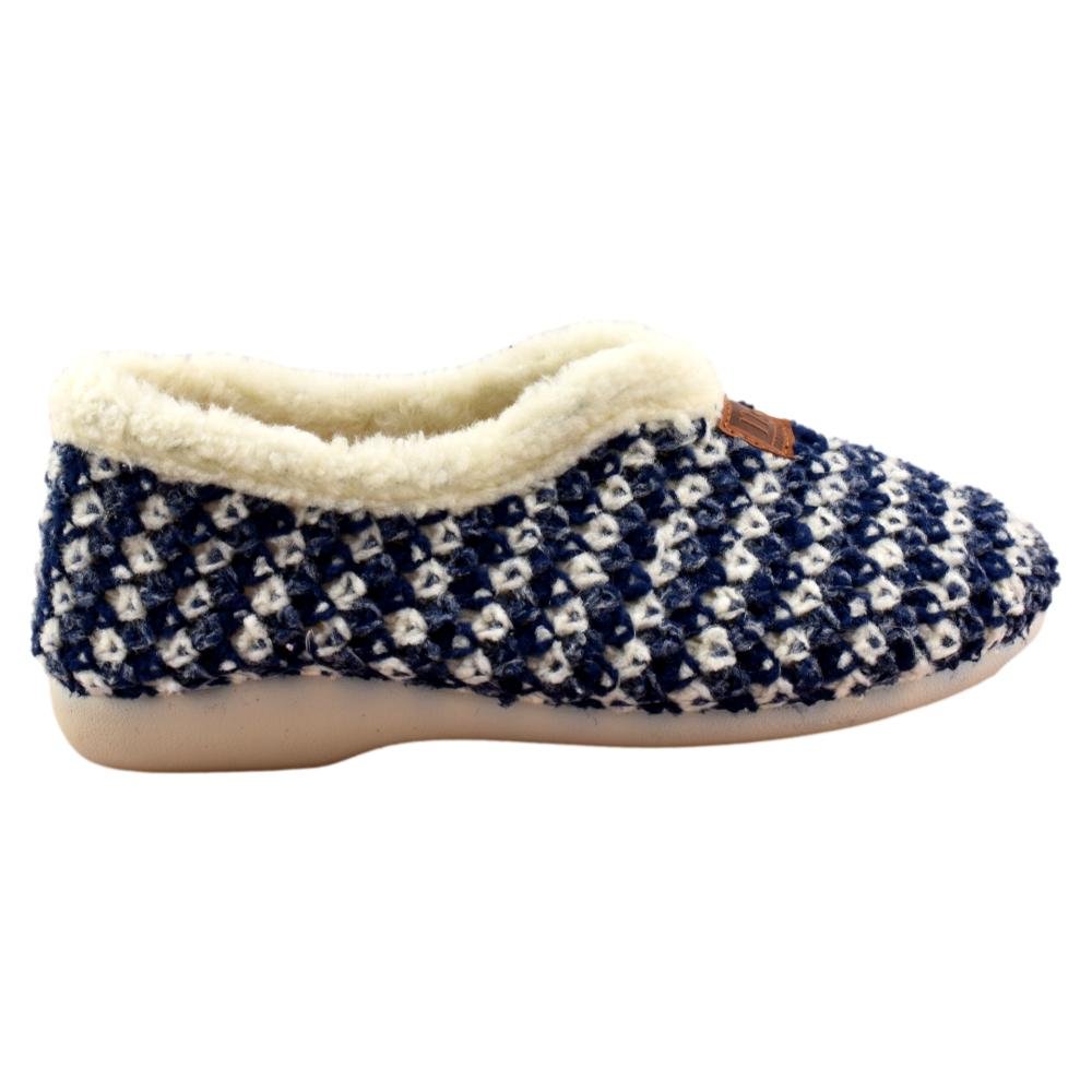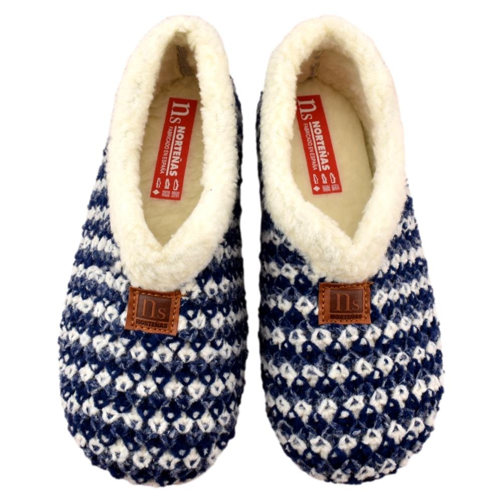 FABRICADO EN ESPAÑA. Zapatillas de casa de lana trenzada bicolor en tonos azules. Interior y plantilla forradas de pelo, que aporta calidez y bienestar en los fríos días de invierno. Piso de goma flexible.