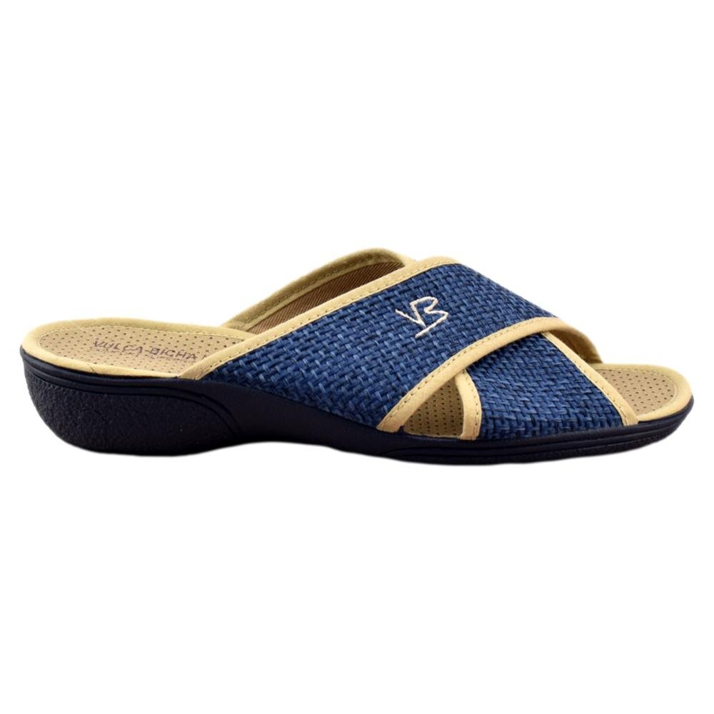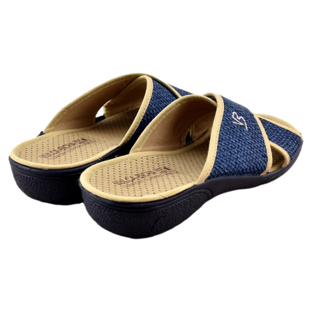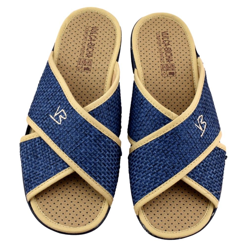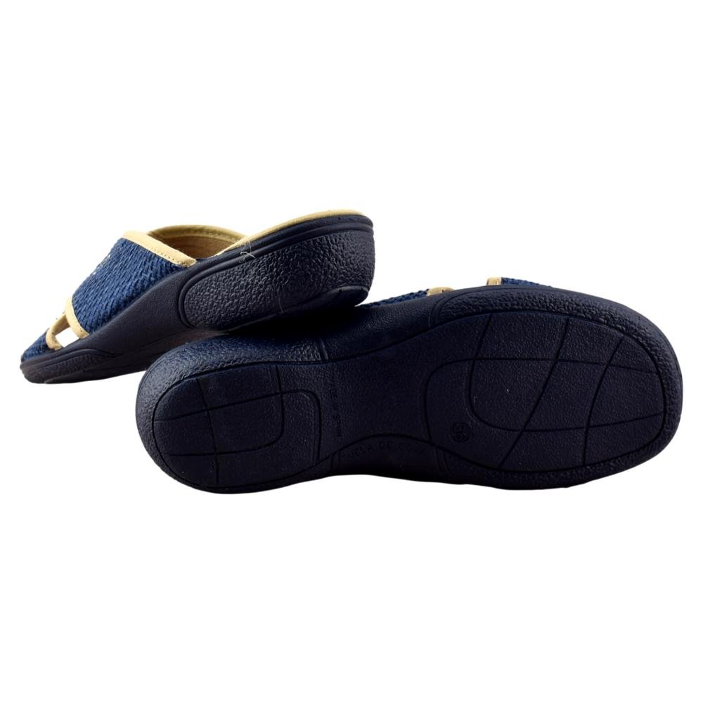 FABRICADO EN ESPAÑA. Zapatilla de casa con tejido muy suave y tiras cruzadas que se adaptan a cualquier anchura de pie. Ideal para pies anchos y delicados. Piso de goma flexible y antideslizante.