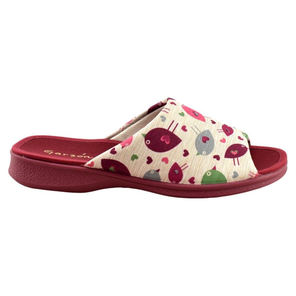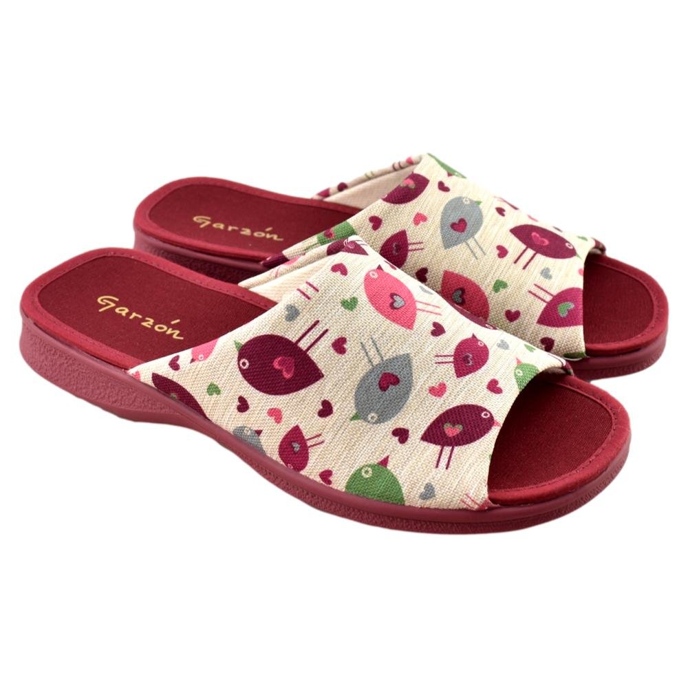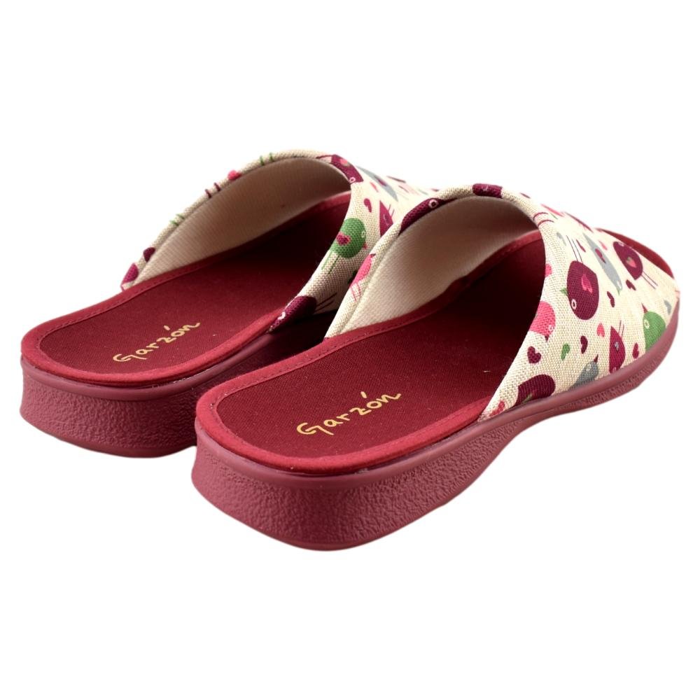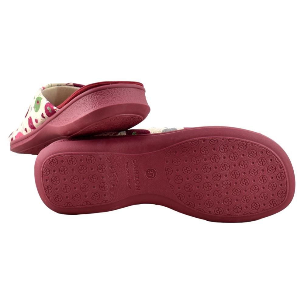 FABRICADO EN ESPAÑA. Zapatillas fabricadas con materiales de 1ª calidad. Tejido muy fresco y suave al tacto con alegre estampado en tonos burdeos. Piso de goma flexible.