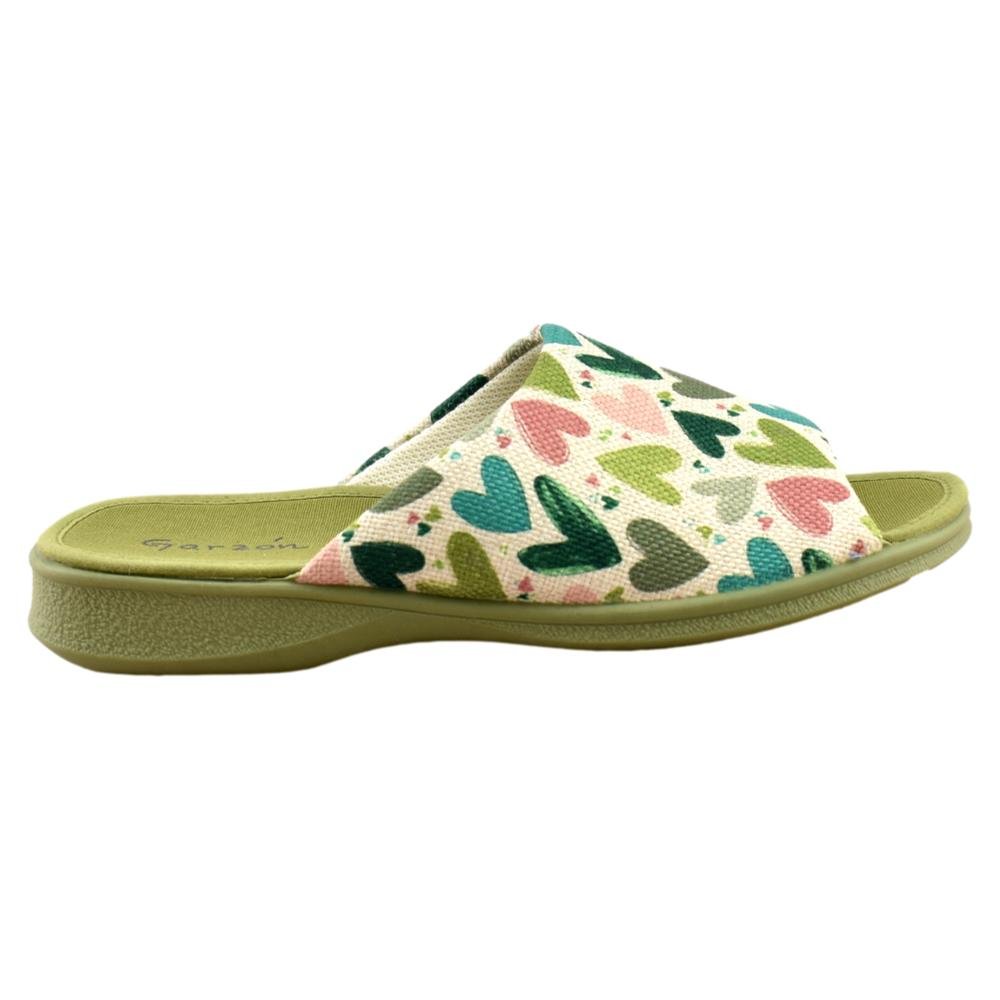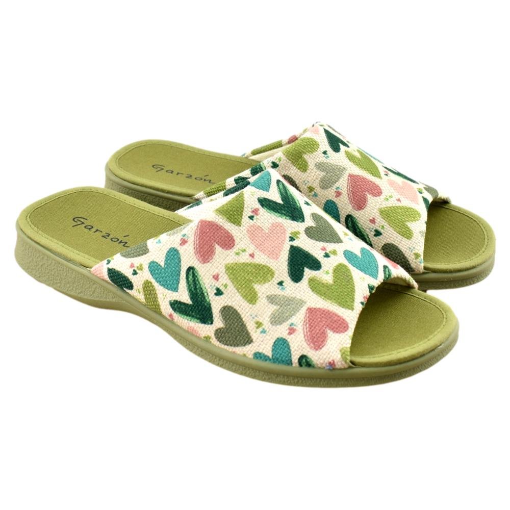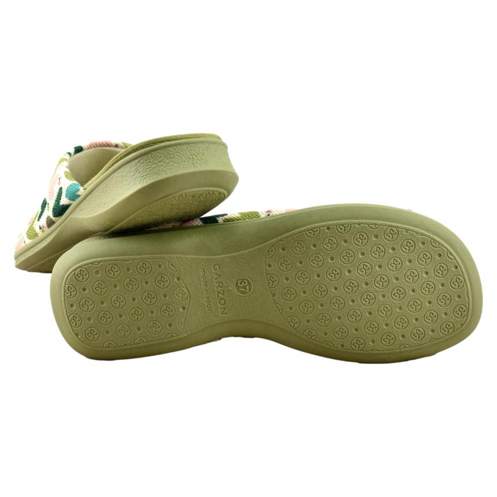 FABRICADO EN ESPAÑA. Zapatillas fabricadas con materiales de 1ª calidad. Tejido muy fresco y suave al tacto con alegre estampado en tonos verde kaki. Piso de goma flexible.