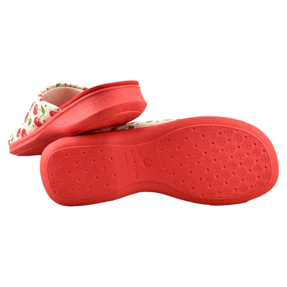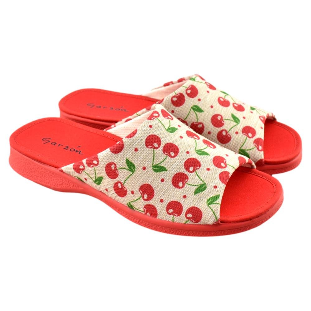 FABRICADO EN ESPAÑA. Zapatillas fabricadas con materiales de 1ª calidad. Tejido muy fresco y suave al tacto con alegre estampado de cerezas en tonos rojo. Piso de goma flexible.
