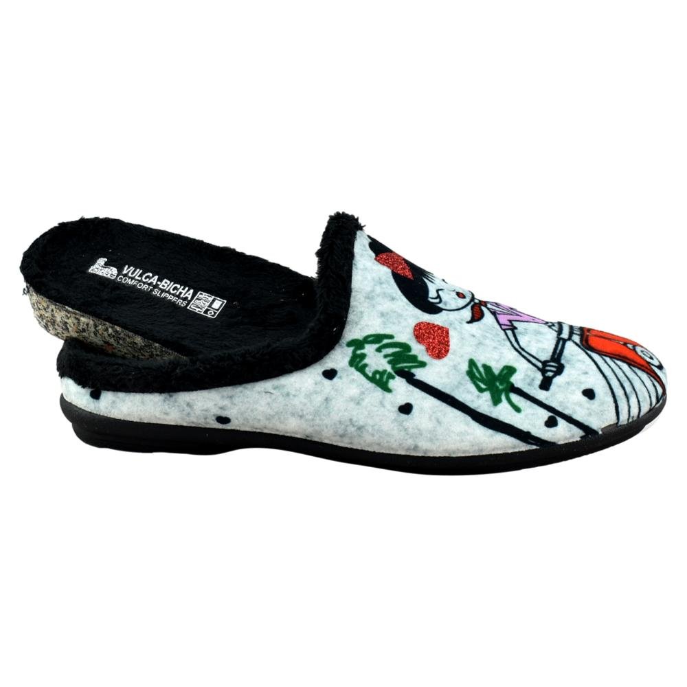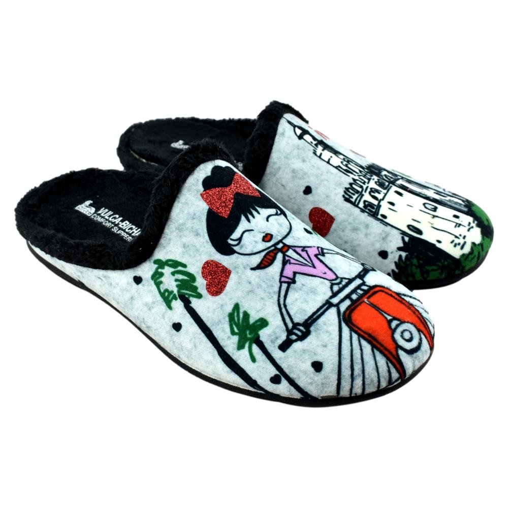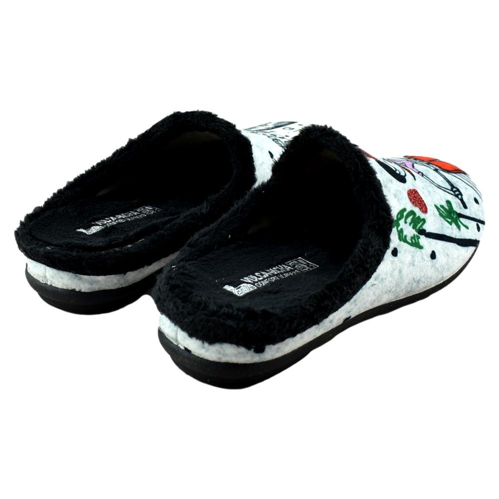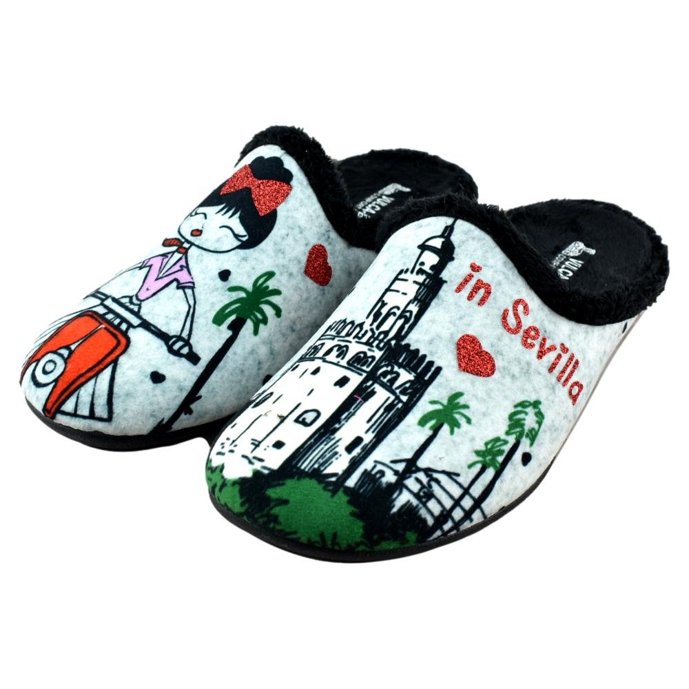 FABRICADO EN ESPAÑA. Zapatillas de casa destalonadas con plantilla extraíble. Piso de goma flexible y antideslizante con forro muy cálido y agradable. Con motivo de la Torre del Oro, estas zapatillas están inspiradas en la ciudad de Sevilla.