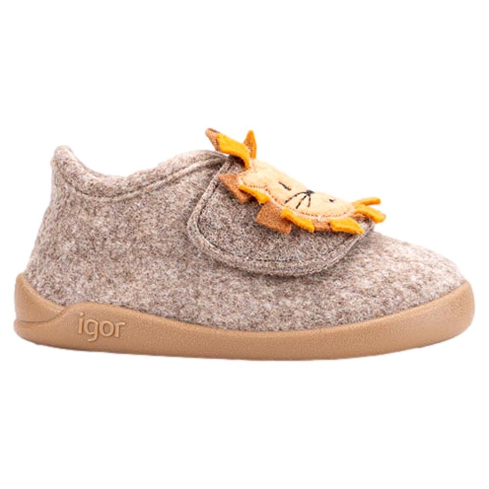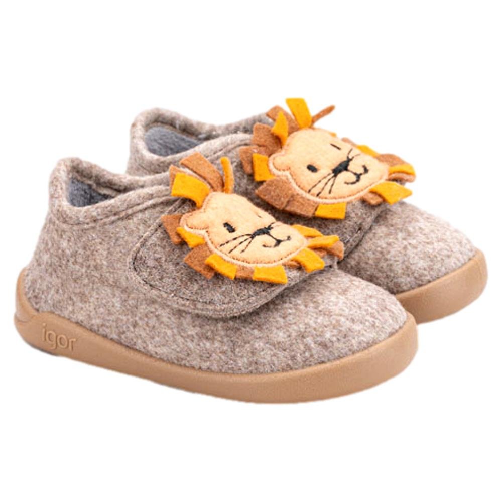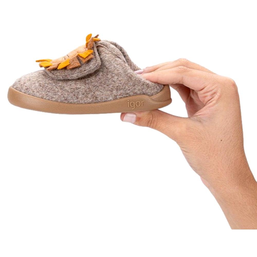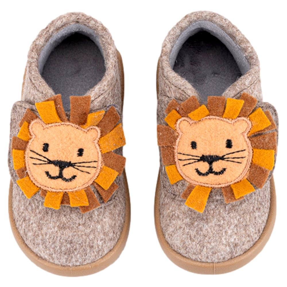 FABRICADO EN ESPAÑA. Zapatilla de estar por casa para niños y niñas con detalle de león, de concepto barefoot, cero drop, flexible y blandita, fabricada en un tejido súper blandito, calentito y suave.