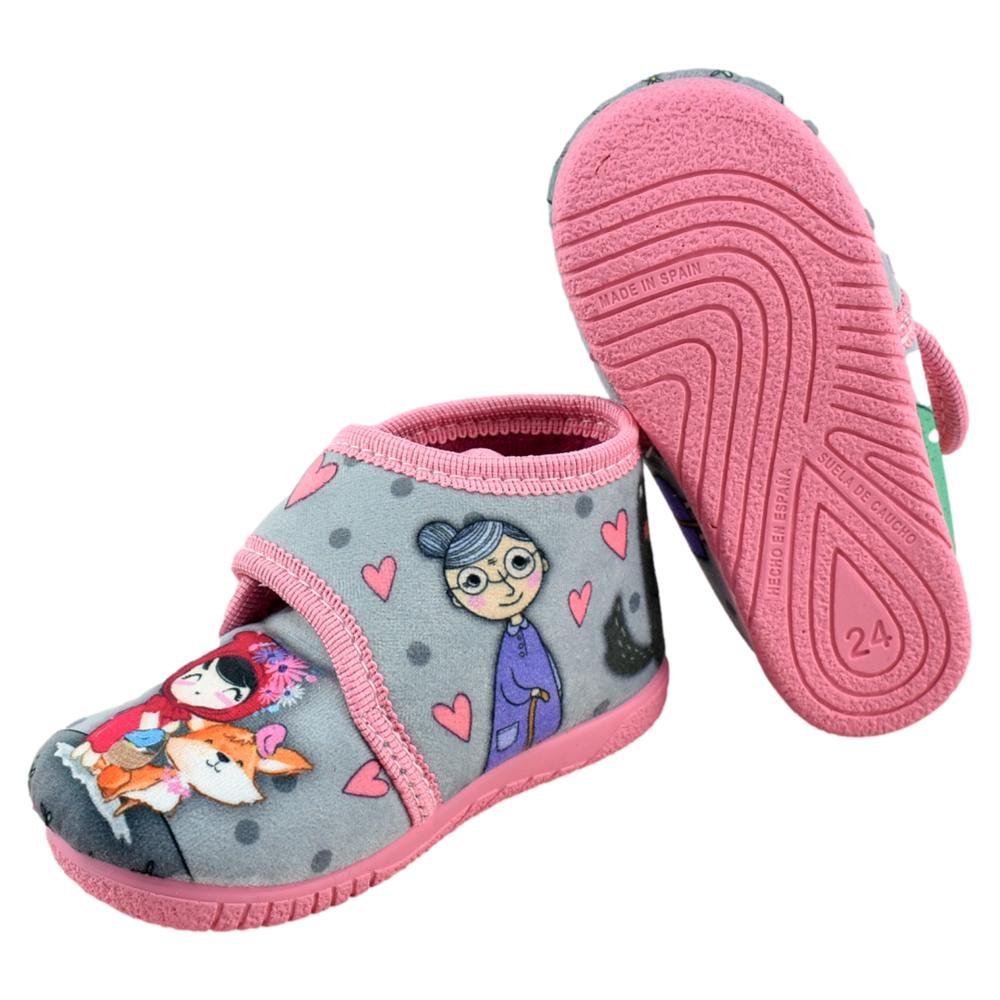 FABRICADO EN ESPAÑA. Zapatillas de casa tipo bota con cierre adhesivo que asegura un ajuste perfecto. Motivos del cuento de caperucita con todos sus personajes.