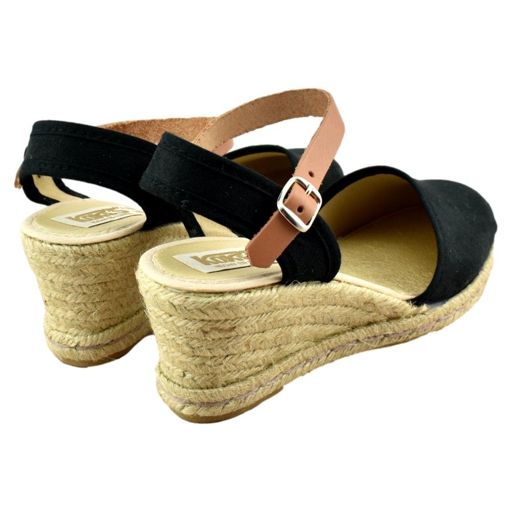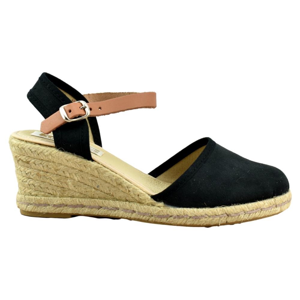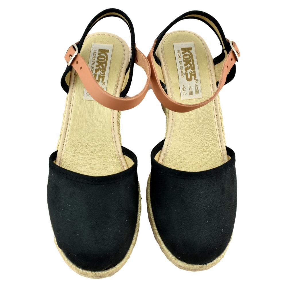 Zapatillas de esparto de 5 cuerdas y 7cm de altura. Pala textil de antelina en color negro y correa cuero al tobillo con cierre de hebilla. Piso flexible y plantilla acolchada.