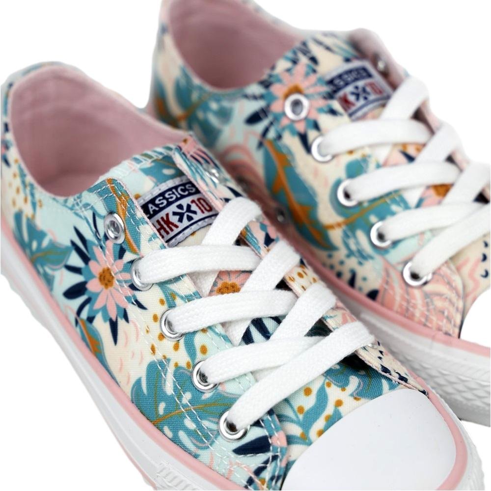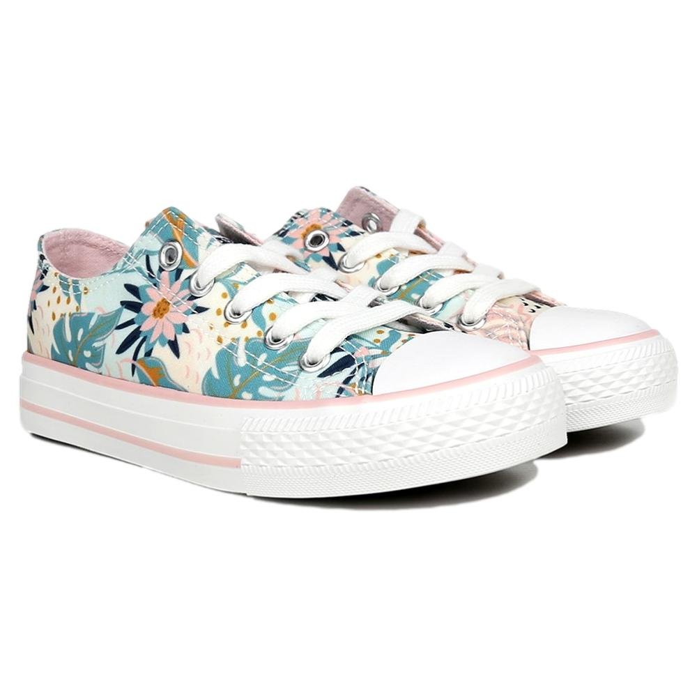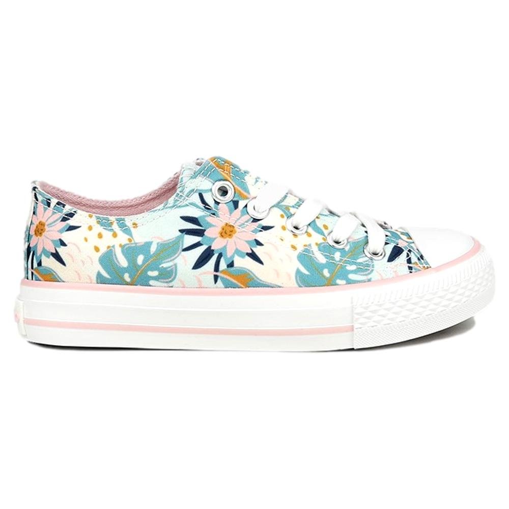 Deportivo de flores para niña. Material de tejido estampado con print floral y cierre acordonado. Puntera redondeada de goma y suela blanca con líneas a contraste.