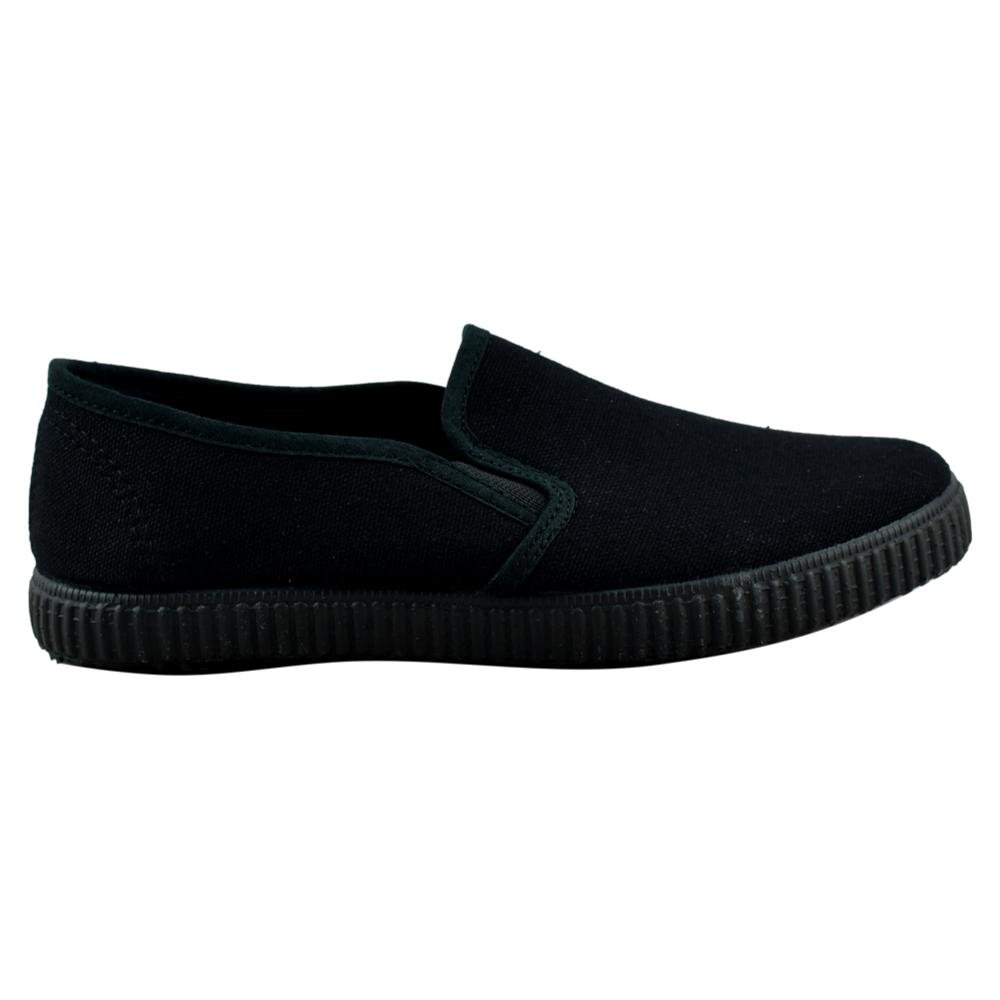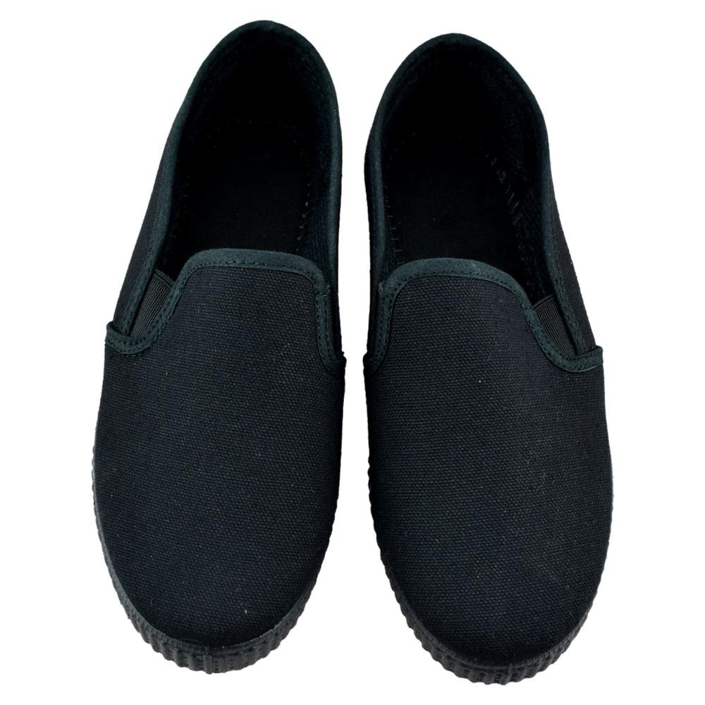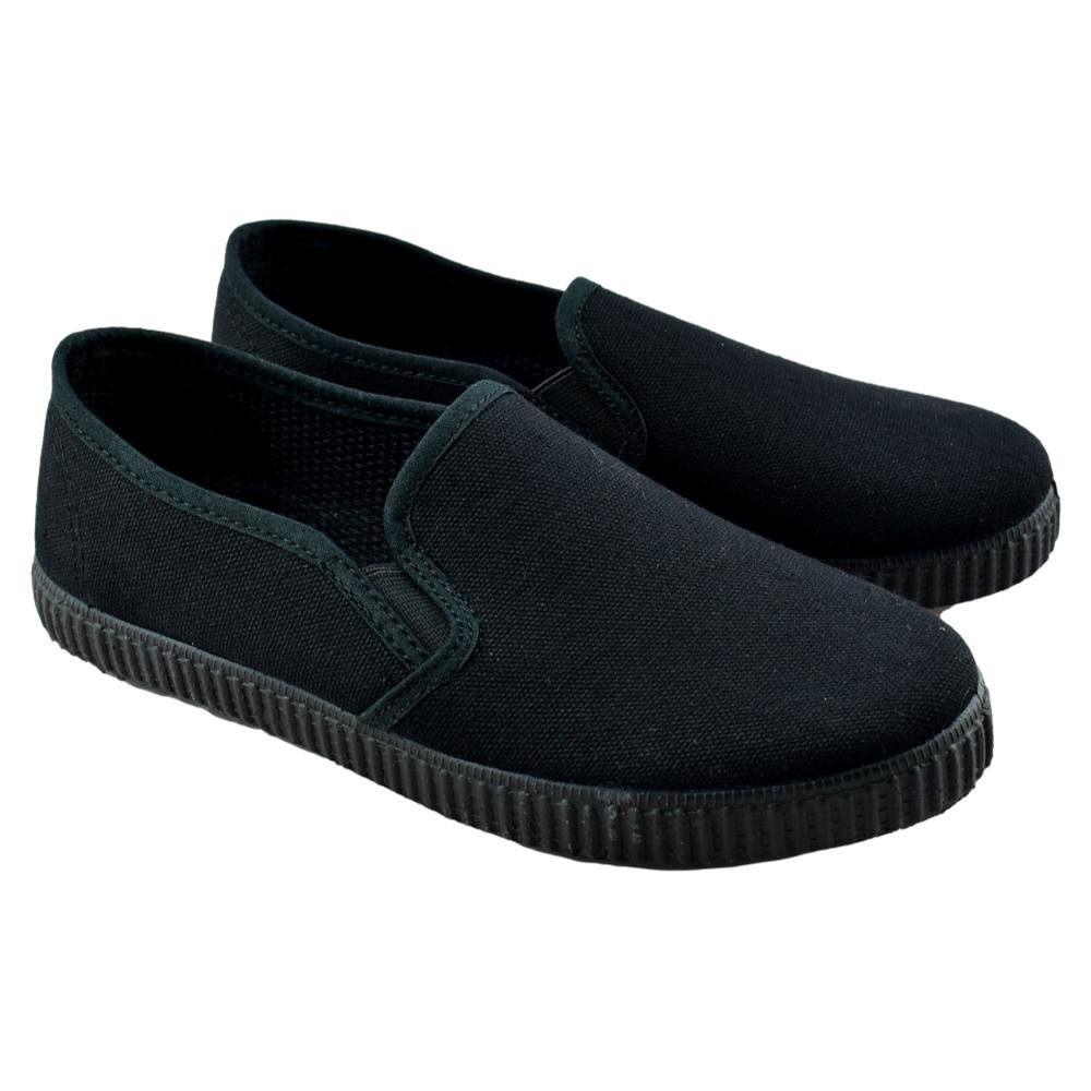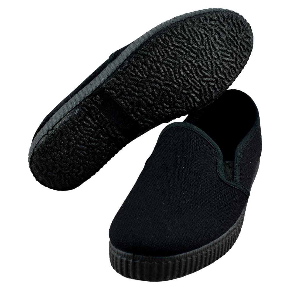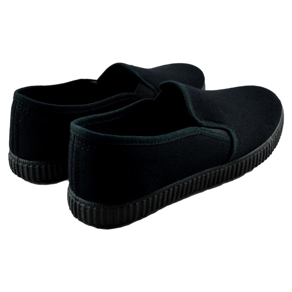 FABRICADO EN ESPAÑA. Zapatillas negras de lona con piso de goma y elásticos laterales.